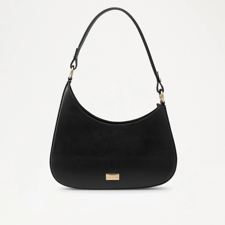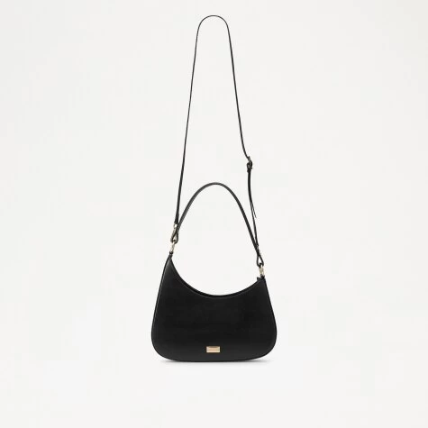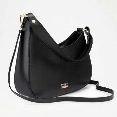A refined shoulder bag with a chic finish, Sway pushes style boundaries with its unexpected asymmetric shape. Made in Italy from supple black calf leather, this distinguished design features a curved topline and soft rounded base, giving it a geometric feel. Gold circular buckles secure the bag’s leather shoulder strap, while a gold logo plate on the front of the bag ramps up its glamour credentials. It comes complete with an inside leather patch featuring debossed logo branding, and black cotton lining.