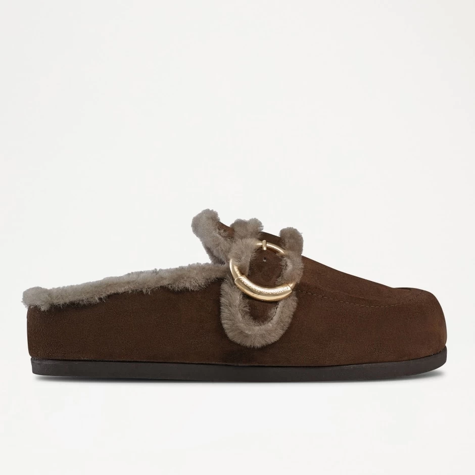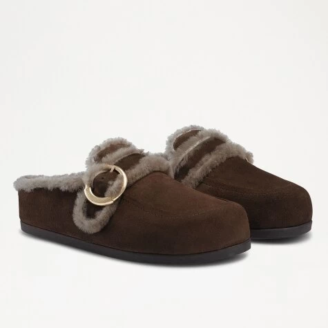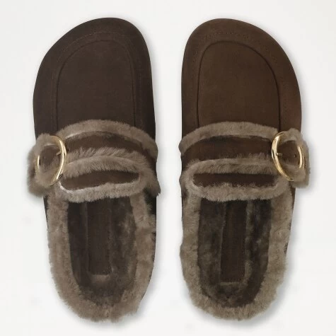 Boasting the characteristics of a classic slipper silhouette and the functionality of a practical outdoor shoe, say hello to our comfortable hybrid Luxo in dark brown. Drawing on our bestselling Dellacozie mule, this style has been crafted in Italy from smooth taupe suede and lined with the softest white shearling to create the ultimate cosy shoe. Detailed with a clog-inspired trim complete with shearling lining and a gold R&B circle buckle, make a statement with our comfortable new addition perfect for both indoors and out.