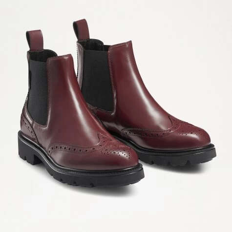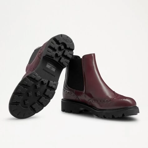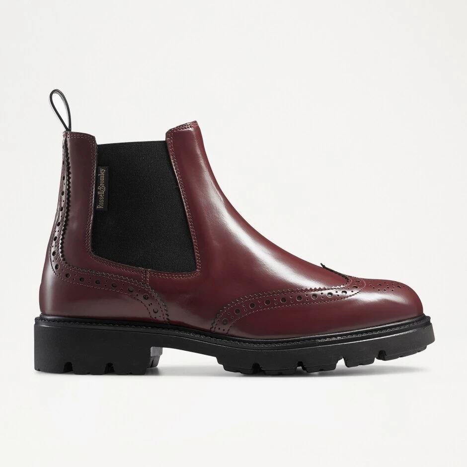 A hip addition to our iconic ankle boots range, Library is a visually striking mix of brogue and Chelsea boot elements. This fusion design has been crafted in Italy from bordeaux-red calf leather, and features heritage wing tip and bridge detail brogue patterns. Elasticated gussets and leather pull tabs allow you to slip into the design easily, while the chunky cleated sole provides durability and grip when walking. This signature brogue Chelsea boot style is finished off with a sporty fabric logo label and leather lining.