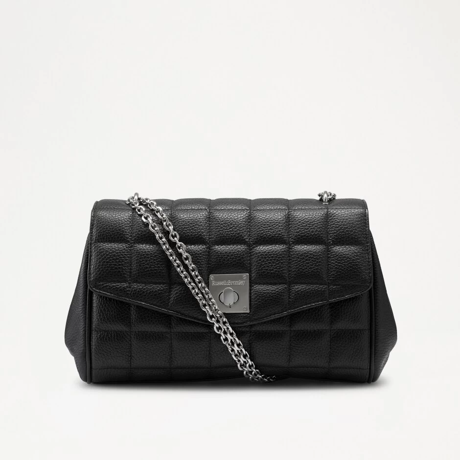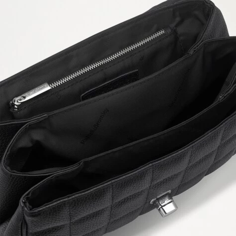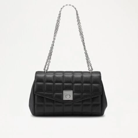 Blending glamorous design details with a texturised finish, District is a quilted leather bag to make a statement with. Crafted in Italy from black grained leather, this exciting design fuses various elements of craft into one eye-catching piece. Featuring a black quilted leather finish, the bag is shaped in a boxy angular silhouette, and features glossy silver hardware across its chain strap and square turnlock closure. Its multi-pocket compartments will come in handy for all of your storage needs, while the long chain crossbody strap can be doubled up and shortened, so the piece can also be worn across the shoulder.