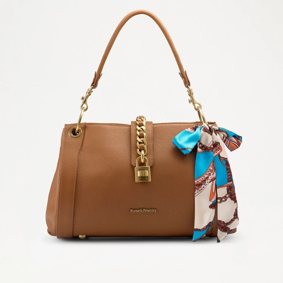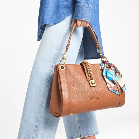 The Lock It Midi is a versatile crossbody bag combining Parisian elegance with stylish accents. Made in Spain from tan grained leather, this spacious and practical design comes with a top handle and crossbody shoulder strap. Its padlock closure detail adds an unexpected edge to the design, while the fabric scarf on the handle rounds off the chic look. Where it for holiday glamour, everyday occasions or elegant nights out.