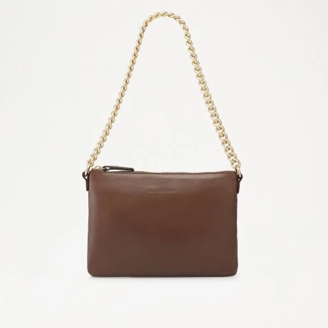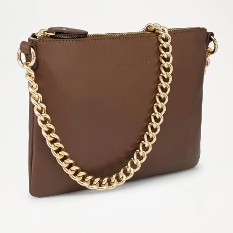 Adding a touch of glamour to the classic clutch, On Point is a modern wardrobe addition for event dressing and beyond. Crafted in Italy from mocha-hued nappa leather, this tactile rectangular pouch is the perfect size for all your essentials. Alongside the buttery leather and practical zip closure, the real star of the show is a chunky golden chain strap, which can be worn as a shoulder strap, left as a glistening adornment or removed entirely, to allow you to style this elegant clutch your way.