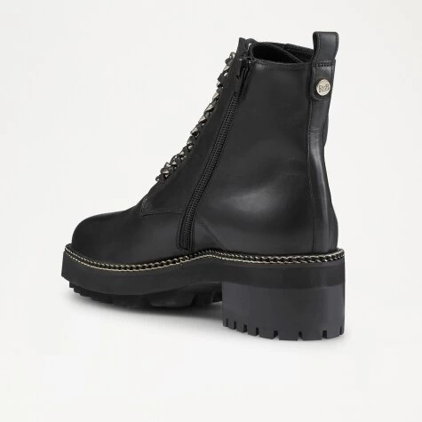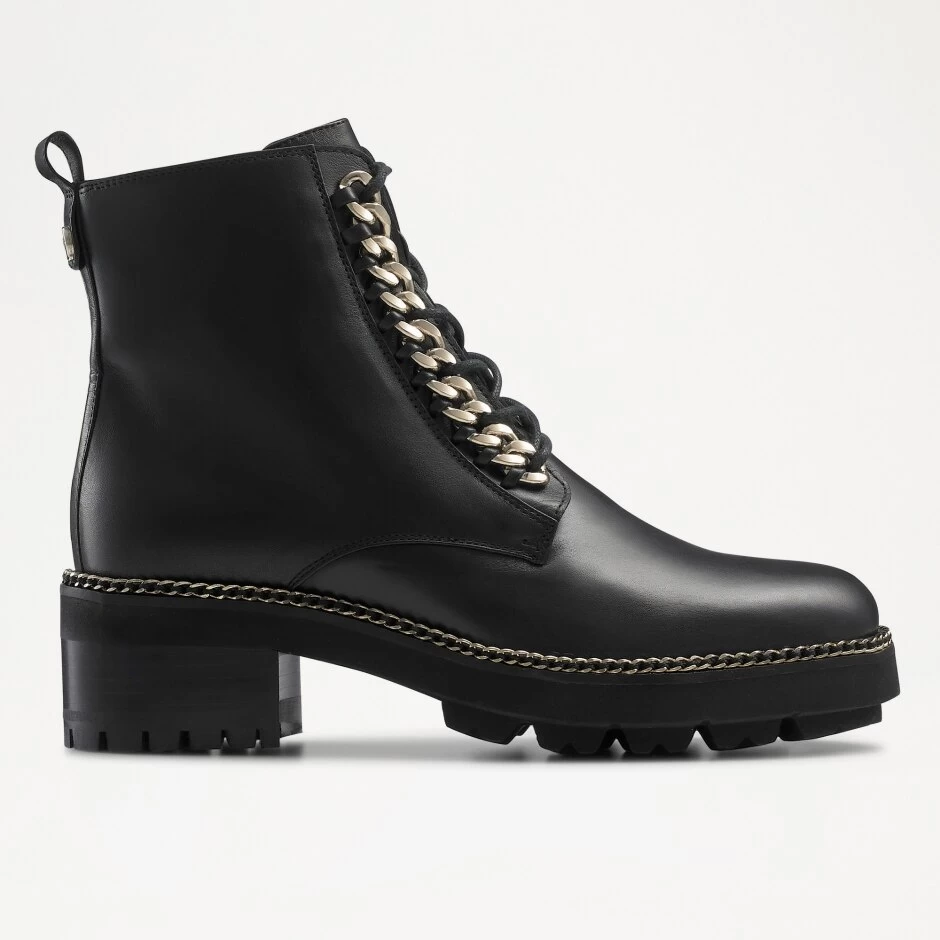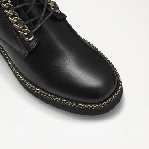 Ease into a punk-influenced look with Glamatic, our leather ankle boot featuring glossy gold chains. Crafted in Italy from polished black calf leather, this eye-catching design ramps up the glamour factor with chunky gold chain details across the eyelets. It also comes with chain details across the welt for added punk-rebel shine. This statement piece is finished off with a trend-led chunky sole complete with cleated grooves for a solid grip.