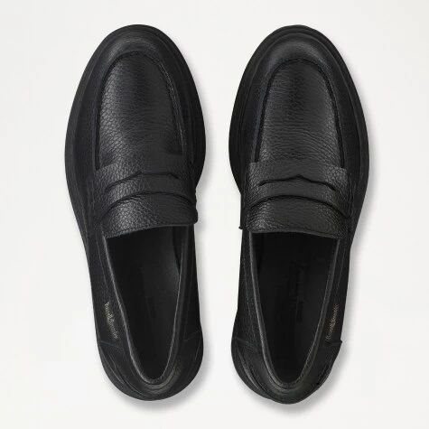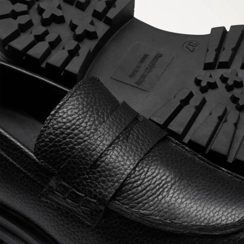 A classic penny loafer with plenty of retro appeal, College is an updated version of our bestselling loafer design. Crafted in Italy from black grained leather, this textured piece features a bold silhouette thanks to its chunky cleated sole. This slip-on style has a round toe shape and a stacked finish across the welt. It’s also finished off with a branded fabric logo feature and artisanal stitch details across the upper and back heel.