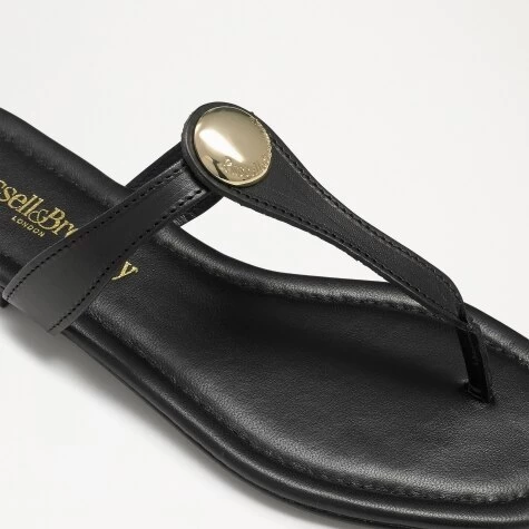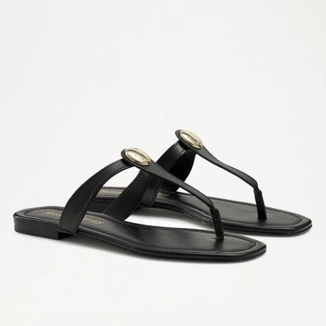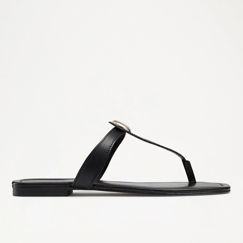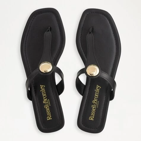 New style Lauretta is an elegant take on a classic thong sandal silhouette. Crafted in Italy from soft black calf leather and finished with a nappa interior sock, this chic design offers effortless summer styling. Finished with a bold golden stud and square toe, Lauretta is a timeless shape that will see you through sunny days in style. Pair with straight leg denim or a floaty maxi dress as the weather begins to warm.