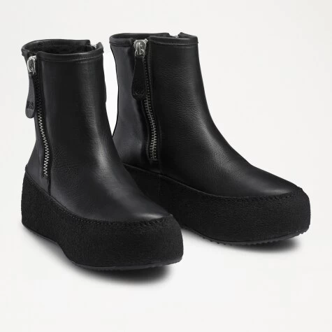 Reinvented with a rebellious edge, Zipper is a flatform boot with plenty of cutting-edge style features. Crafted in Italy from black grained leather, this everyday ankle boot evokes a playful punk mood thanks to its double side zip fastenings and statement-making oversized zip pulls. Composed on a texturised crepe sole for cushioned comfort, the boot also supports soft steps with its shearling and leather lined insole. Pair with relaxed denims for a sharp weekend look, or an oversized jacket for trend-led appeal.