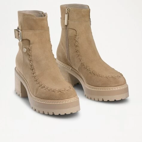 Following on from summer’s popular boho trend, say hello to Hipstitch. Crafted from smooth sand suede that has been treated against the rain, this heeled boot rises just above the ankle. Detailed with a statement whipstitch apron and gold ankle buckle, this style has been finished on a natural stack block heel laid with a durable cleated sole. Secure with the inside zip fastening and take on all winds and weathers in style.