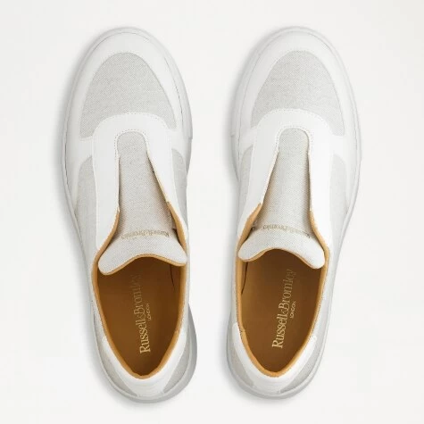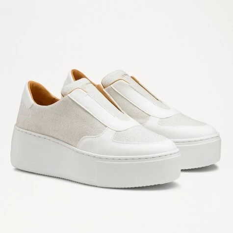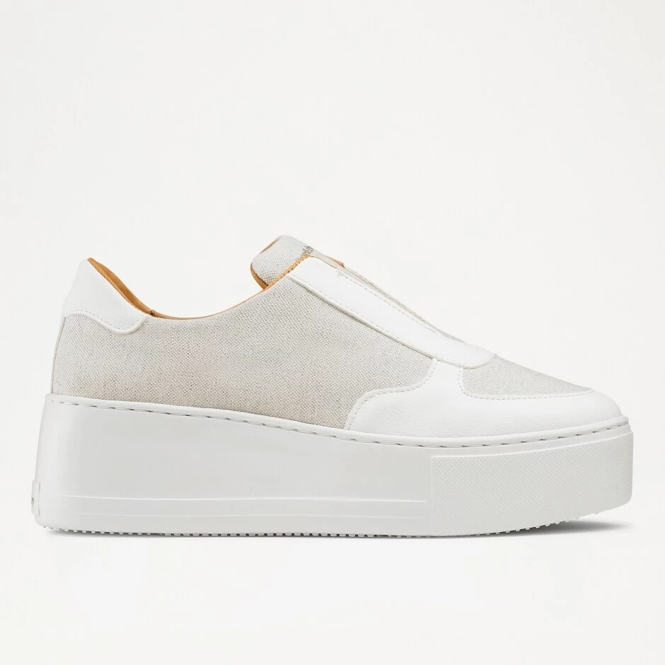 The Park Ave sneaker is the coolest addition to our leisurewear range. Updated in recycled beige canvas and trimmed with luxuriously soft white eco nappa, this lacelss design has been set on a chunky ninties nostalgic lightweight flatform sole. Ideal for elevating you daily style, this easy-on design boasts eco-conscious credentials alongside a minimal silhouette for everyday wear.