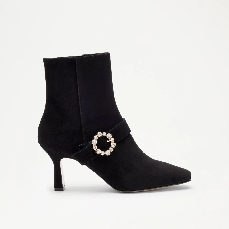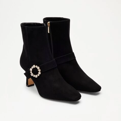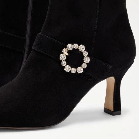 Slip into the party season in glistening embellishments with Gala, our black suede ankle boot. Inspired by Strictly, our matching court shoe, this dazzling design is perfect for the disco or dressed-up nights out thanks to its embellished finish. This iconic look is enhanced by an adjustable vamp strap that’s adorned with a gold circular buckle. Rhinestone crystals are embedded in this feature, which further ramps up the glam factor. The piece is rounded off by natural black leather outsole, offering durability and comfort in each step.
