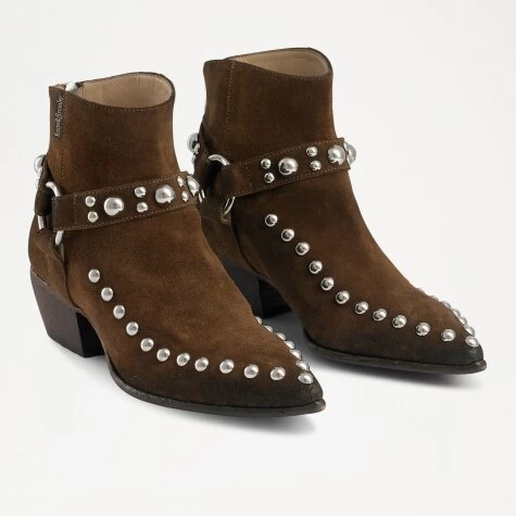 Ramp up the glam factor this season with Harness, our decadently embellished western boot. Crafted in Italy from soft-touch tan suede, this showstopping style references this season’s hot-topic western trend. Inspired by the iconic western boot silhouette, the design is ready for weekend and party dressing thanks to its metallic ring detail and stud-adorned harness straps. The piece comes complete with a small stacked heel and leather lining.