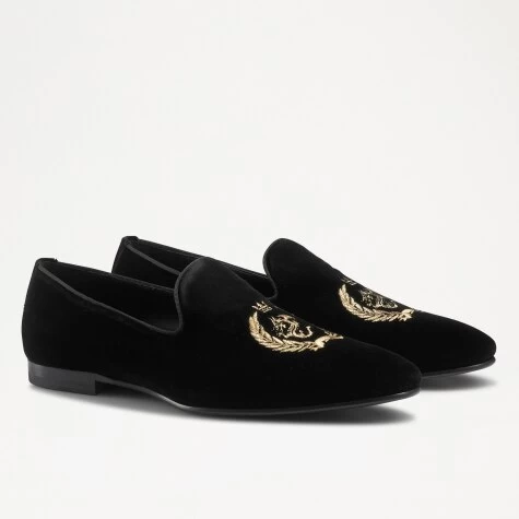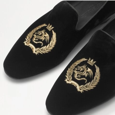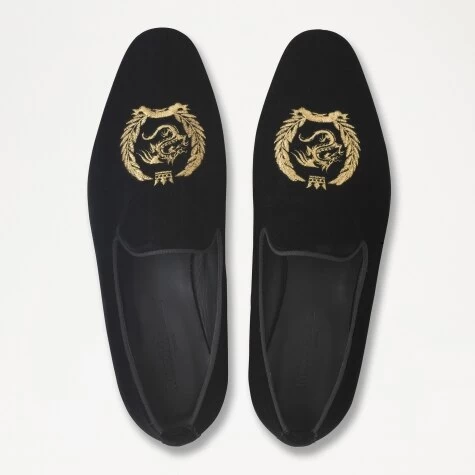 Perfectly primed for smart dinner dates or dress-up events, Drago is a stylish black velvet embroidered slipper. Exquisitely crafted in Italy from sumptuous velvet that’s soft to the touch, this iconic design features an embroidered emblem logo across the saddle. Elasticated inserts feature across the collar, making each shoe simple to slip into. Pair it with a dashing tuxedo or tailored slacks for a high-impact look.