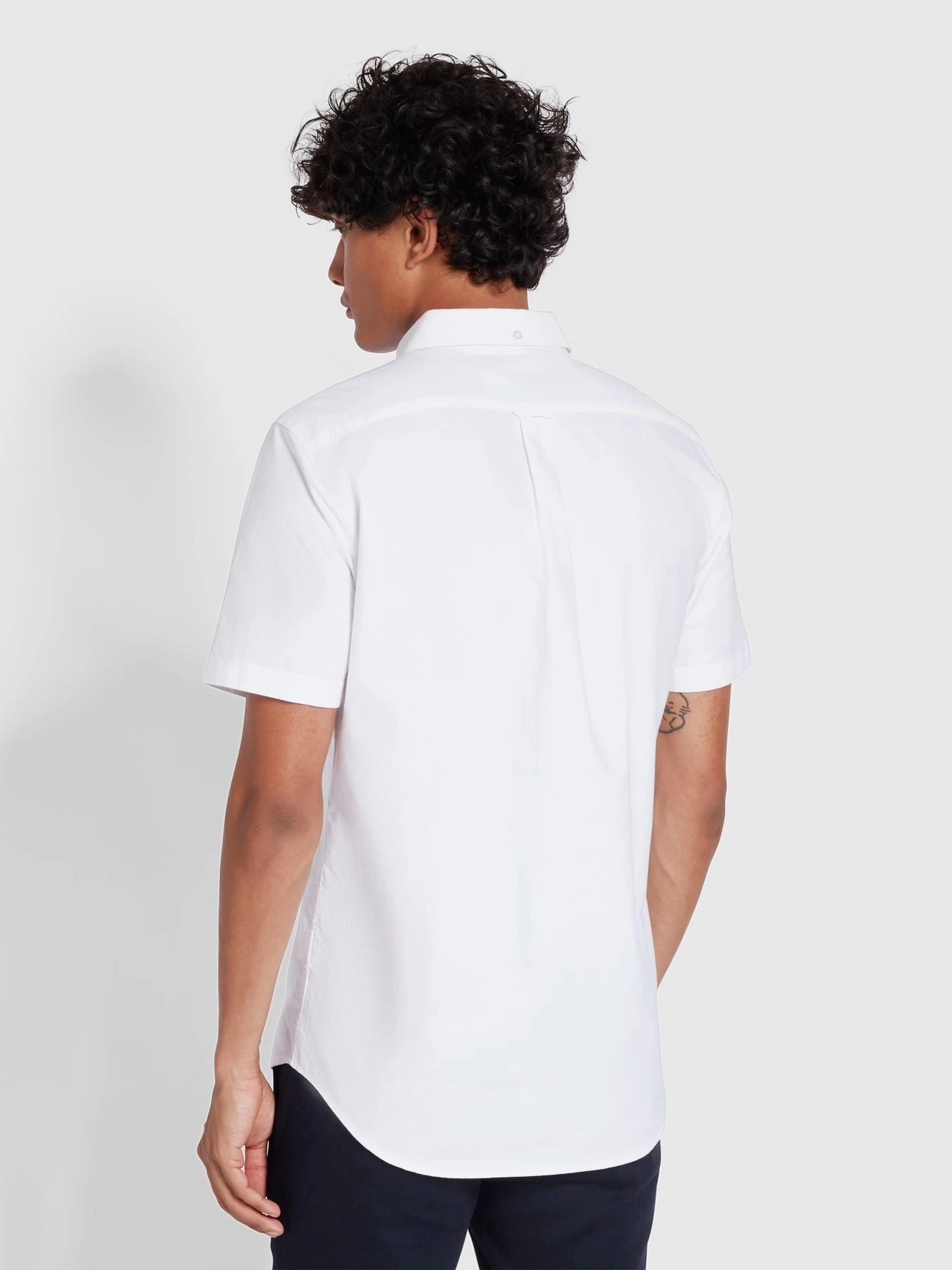 Made from 100% organic cotton, the Farah Brewer short sleeve shirt in White is a timeless piece that looks forever fresh. Using a classic Oxford-weave, the slim-fit design has a traditional button-down collar and front plus our signature gold Farah logo at the left chest.