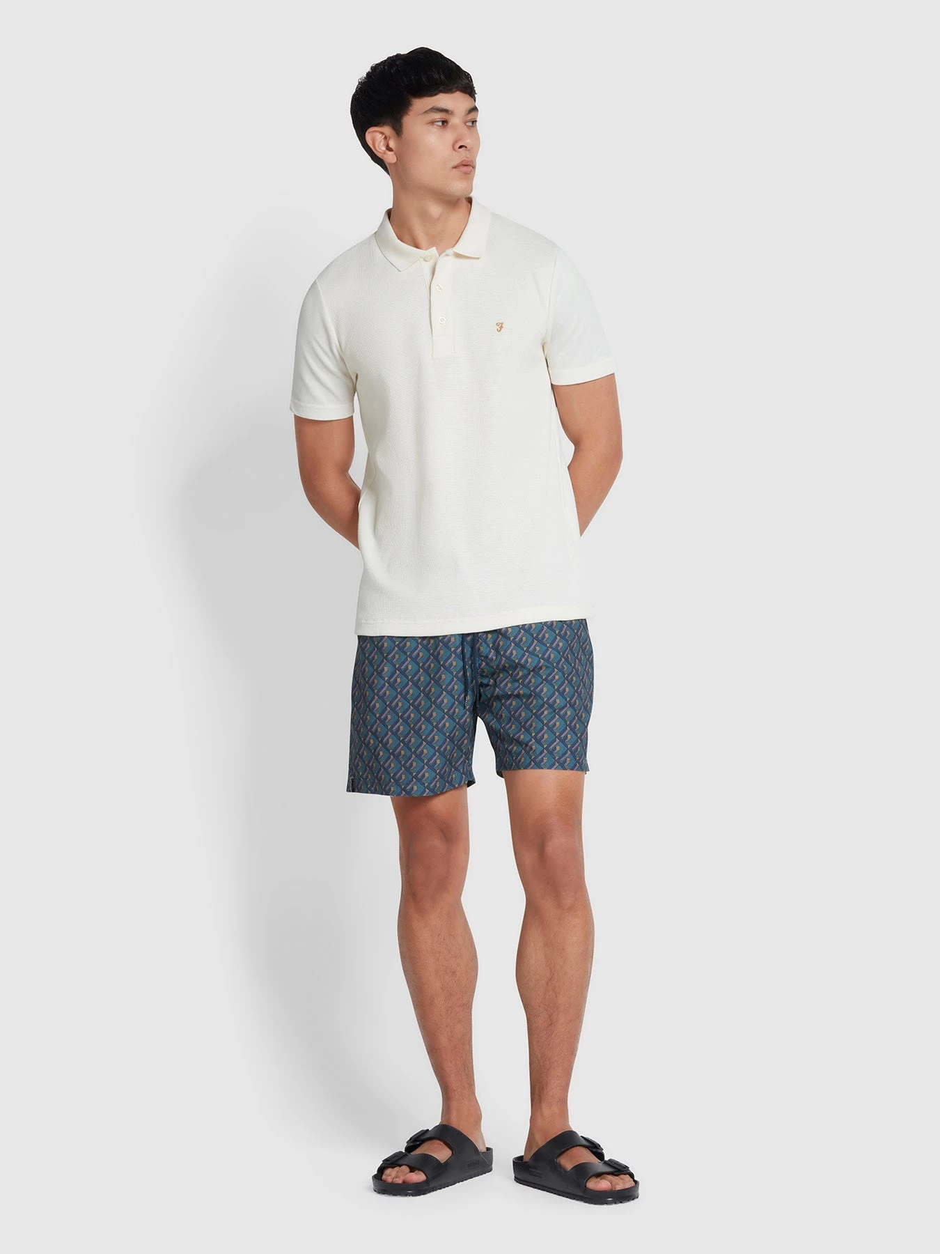 Crafted from recycled polyester, these Colbert Geo Print Swim Shorts in True Navy are the perfect blend of style and sustainability. The regular fit and drawstring fastening ensure a comfortable and secure fit, while the geometric print adds a bold touch. Plus, with two side pockets and a back pocket, there’s plenty of storage for essentials while enjoying a day by the pool.