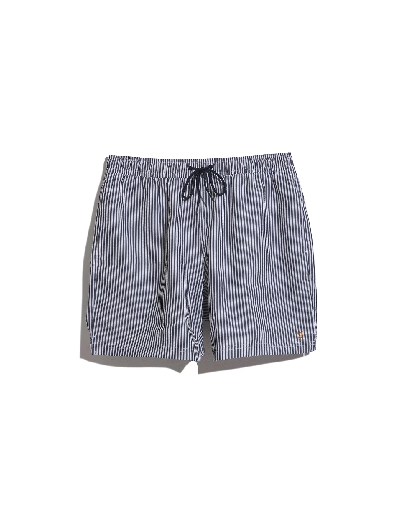 Expertly crafted from 100% recycled polyester, the Colbert Seersucker Stripe Swim Shorts offer both style and sustainability. The regular fit and drawstring fastening ensure a comfortable and secure fit, while the seersucker fabric and bold stripe print add a touch of texture to your beach or poolside look. With two side pockets and a back pocket, these swim shorts also provide convenience for all your essentials.
