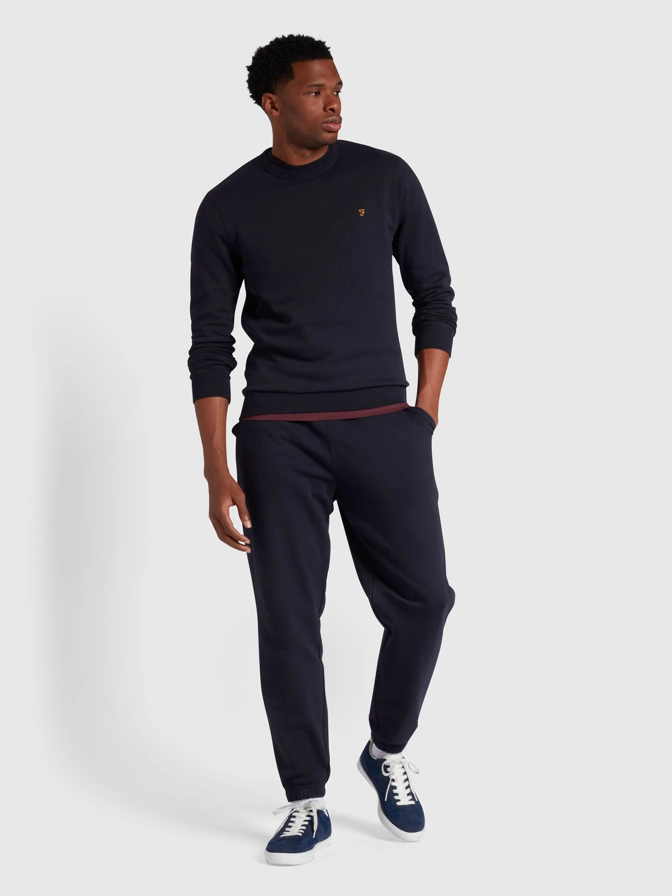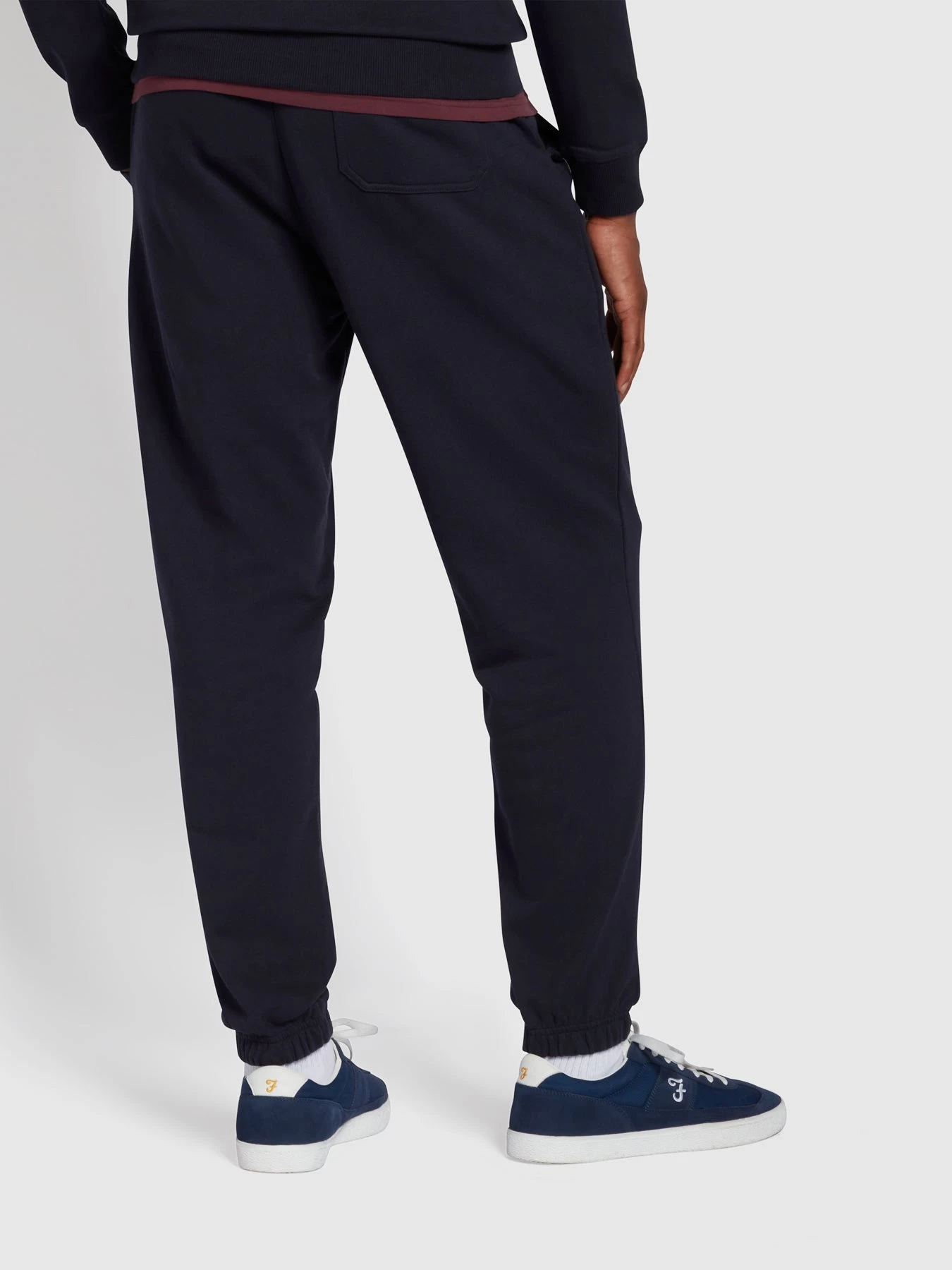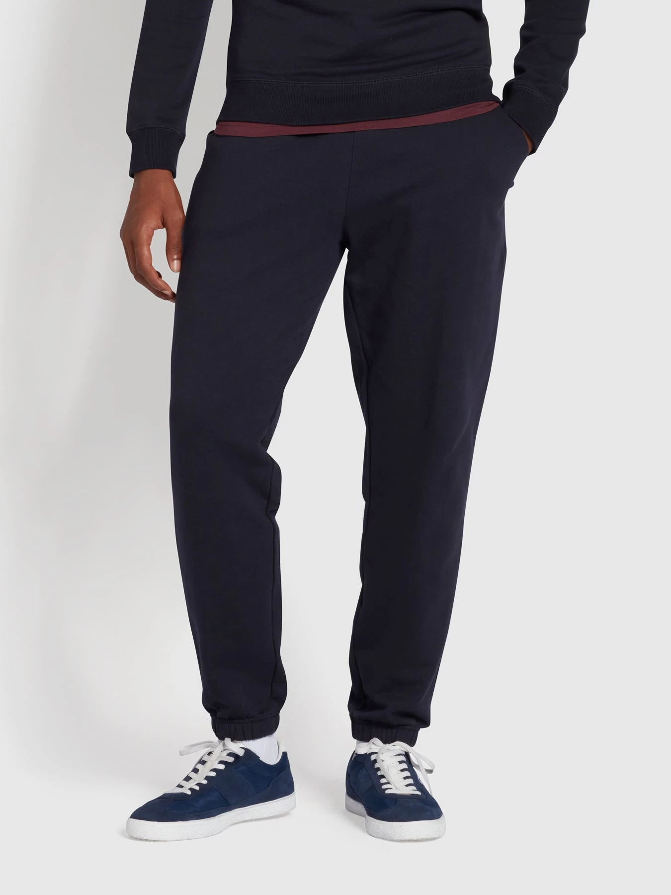 The Farah Durrington in True Navy is a regular-fit jogger featuring angled side pockets, an elasticated waistband with drawstring ties and ribbed cuffs. Crafted in 100% organic cotton, it has our signature gold Farah logo on the reverse square pocket.