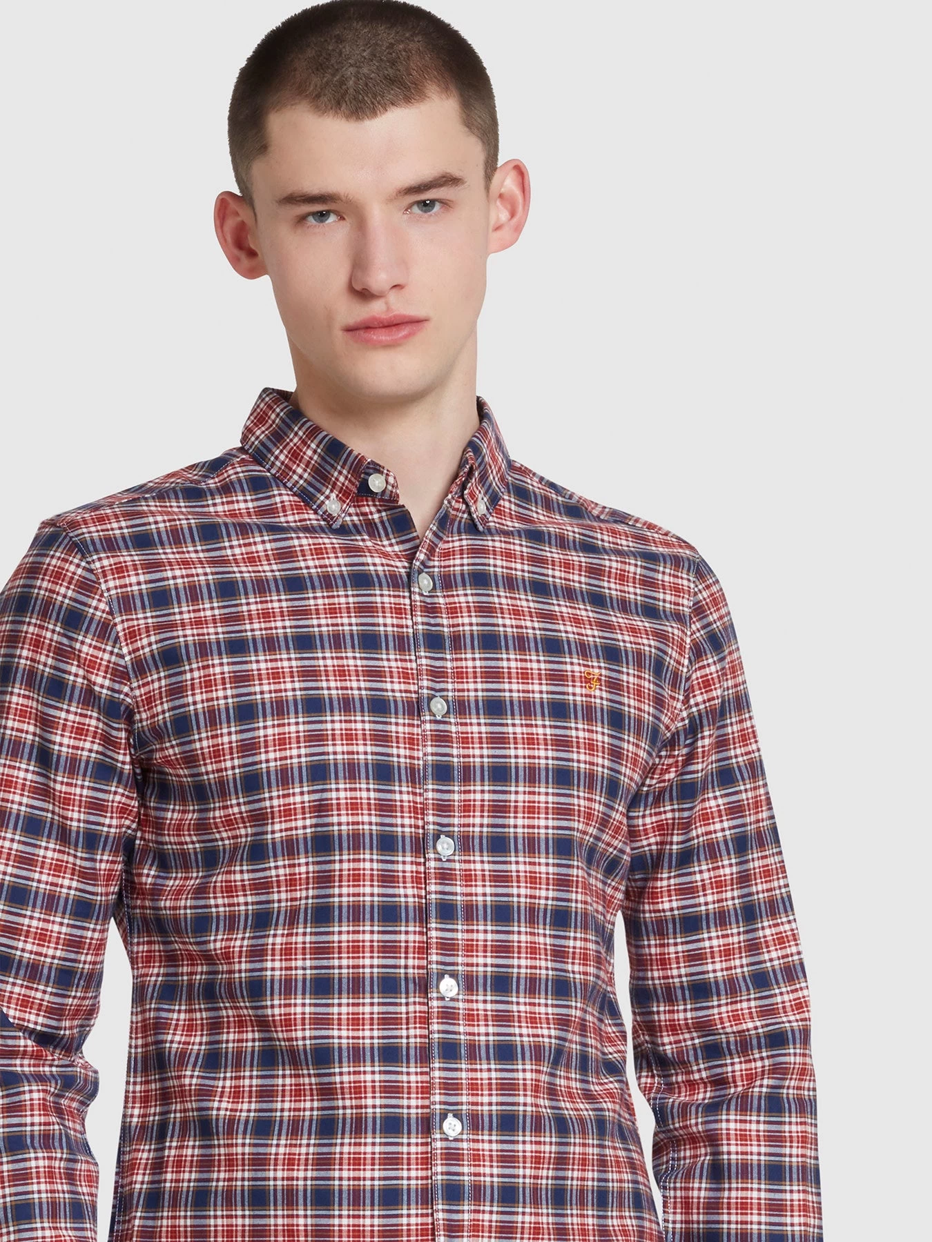 Made from an organic cotton and lyocell blend, the Fraser Slim Fit Check Long Sleeve Shirt in Clay Red offers a soft and comfortable fit. The slim cut gives a modern and flattering silhouette, while the Oxford weave fabric and check print adds a classic element.