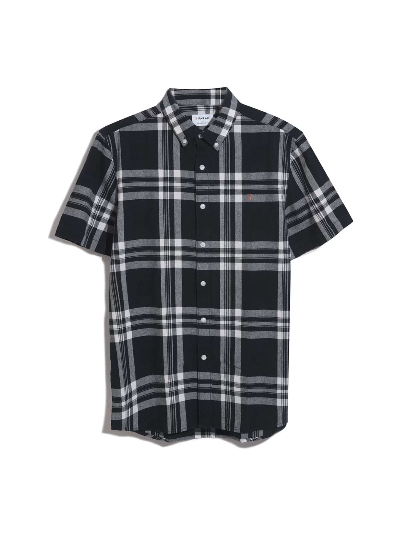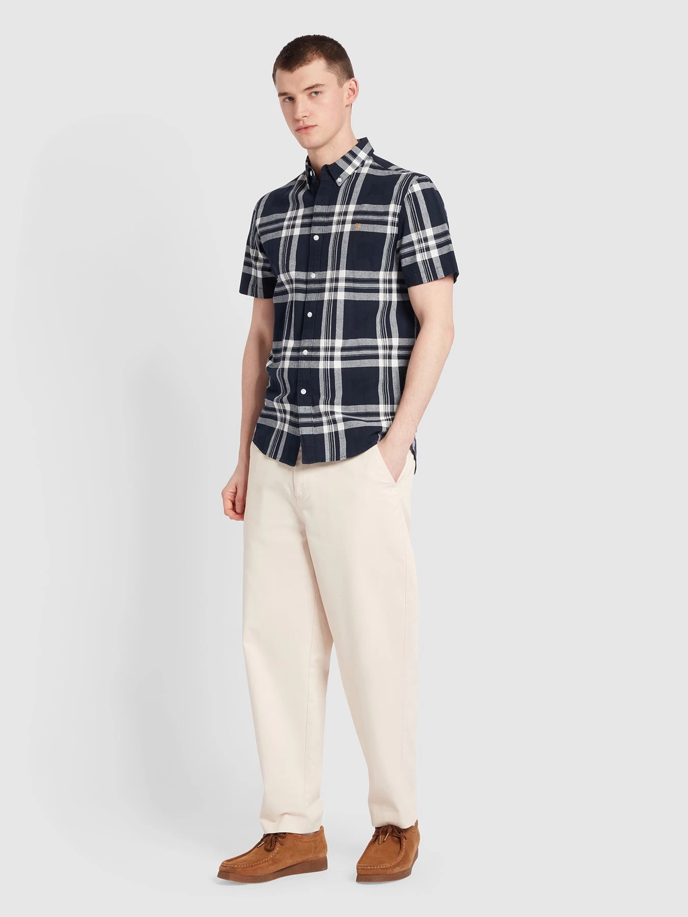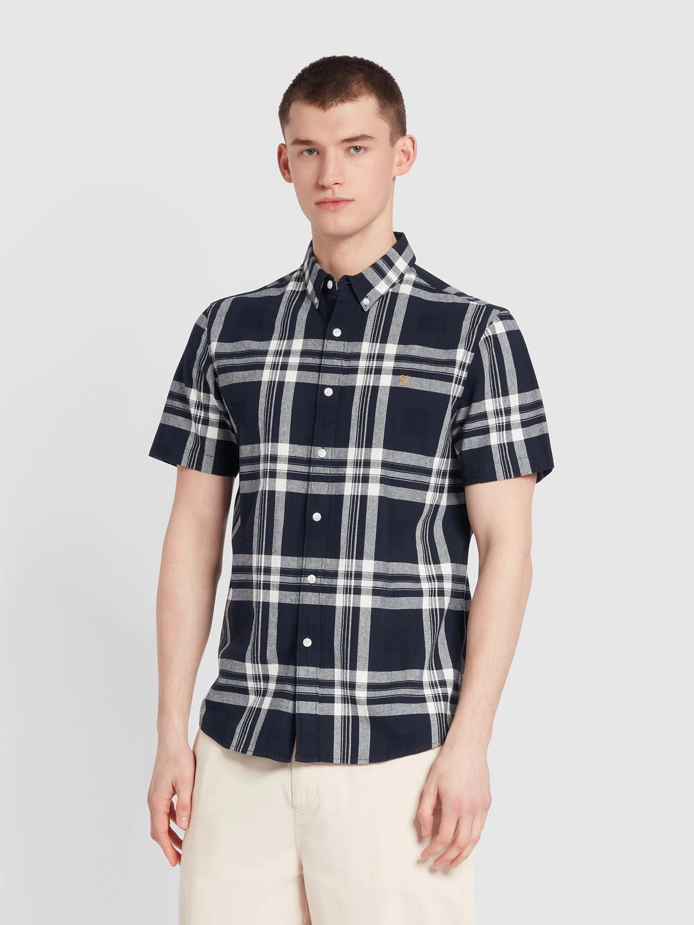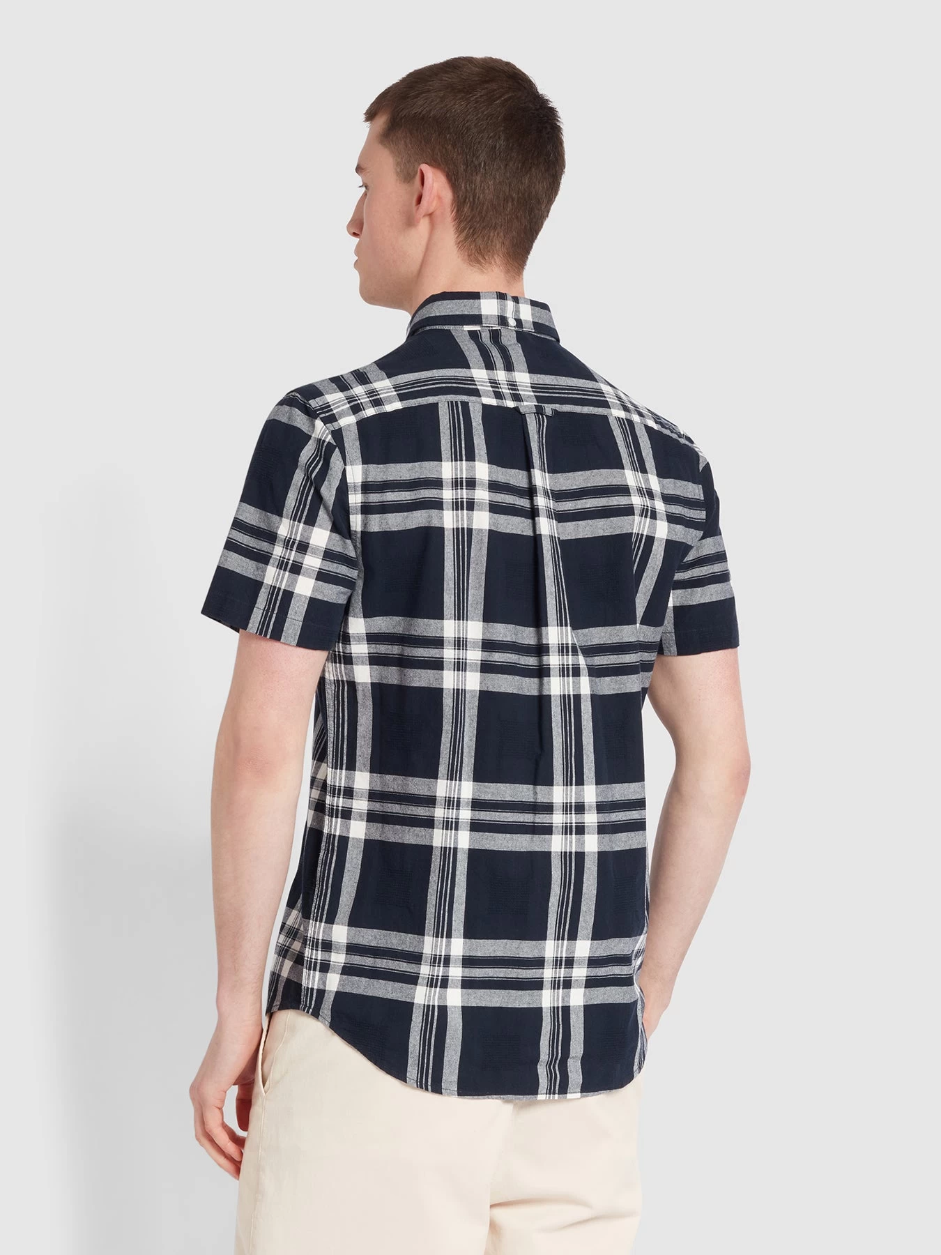 Crafted from organic cotton, the Kele Check Short Sleeve Shirt in True Navy offers a casual fit and features a button-down front and collar. Ideal for any occasion, the textured fabrication adds an extra dimension to this classic piece.