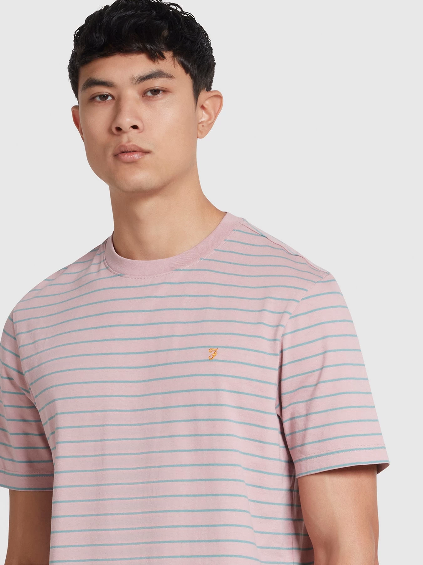 Made with 100% organic cotton, the Oakland Regular Fit Bretton Stripe T-Shirt in Dark Pink offers both comfort and sustainability. Featuring a ribbed collar and iconic embroidered Farah logo, this short sleeve shirt is a versatile addition to any wardrobe.