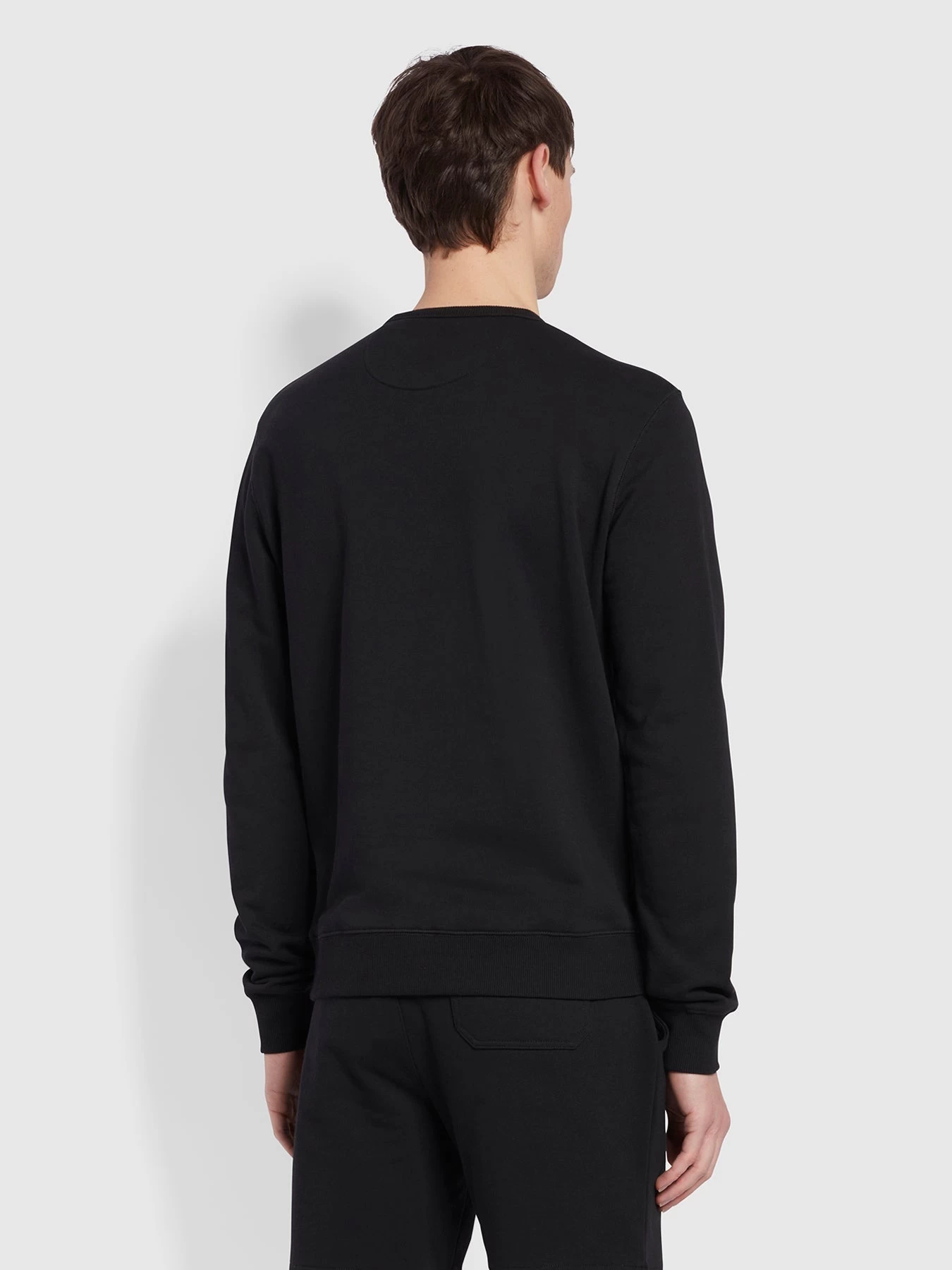 A long sleeve, slim-fit, crew neck, the Farah Tim sweatshirt comes in a timeless Black and is made from 100% organic cotton. Detailing includes a ribbed collar, hem and cuffs and our signature gold Farah logo at the left chest.