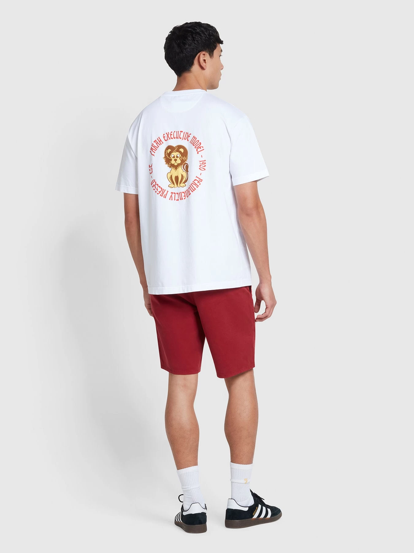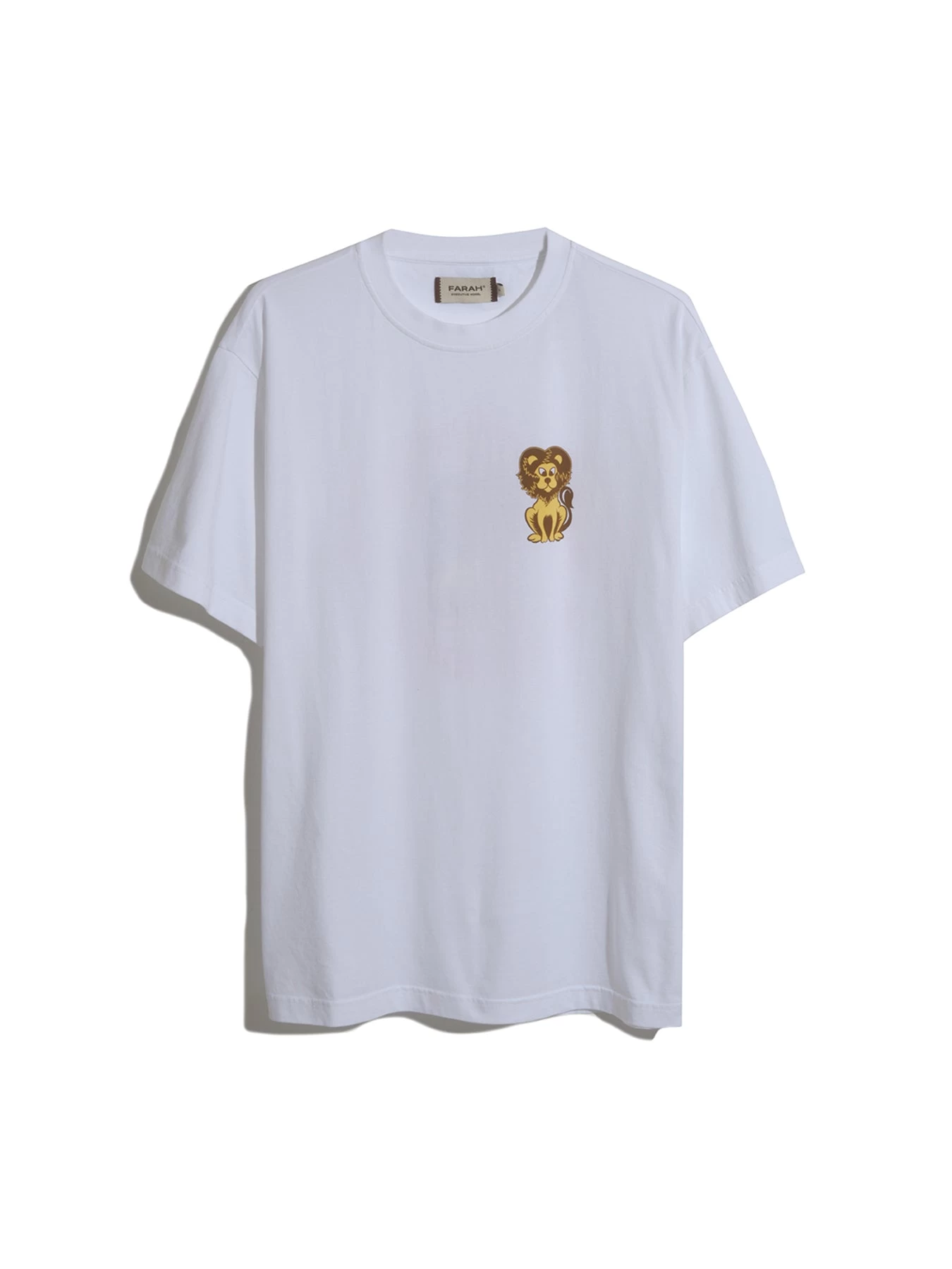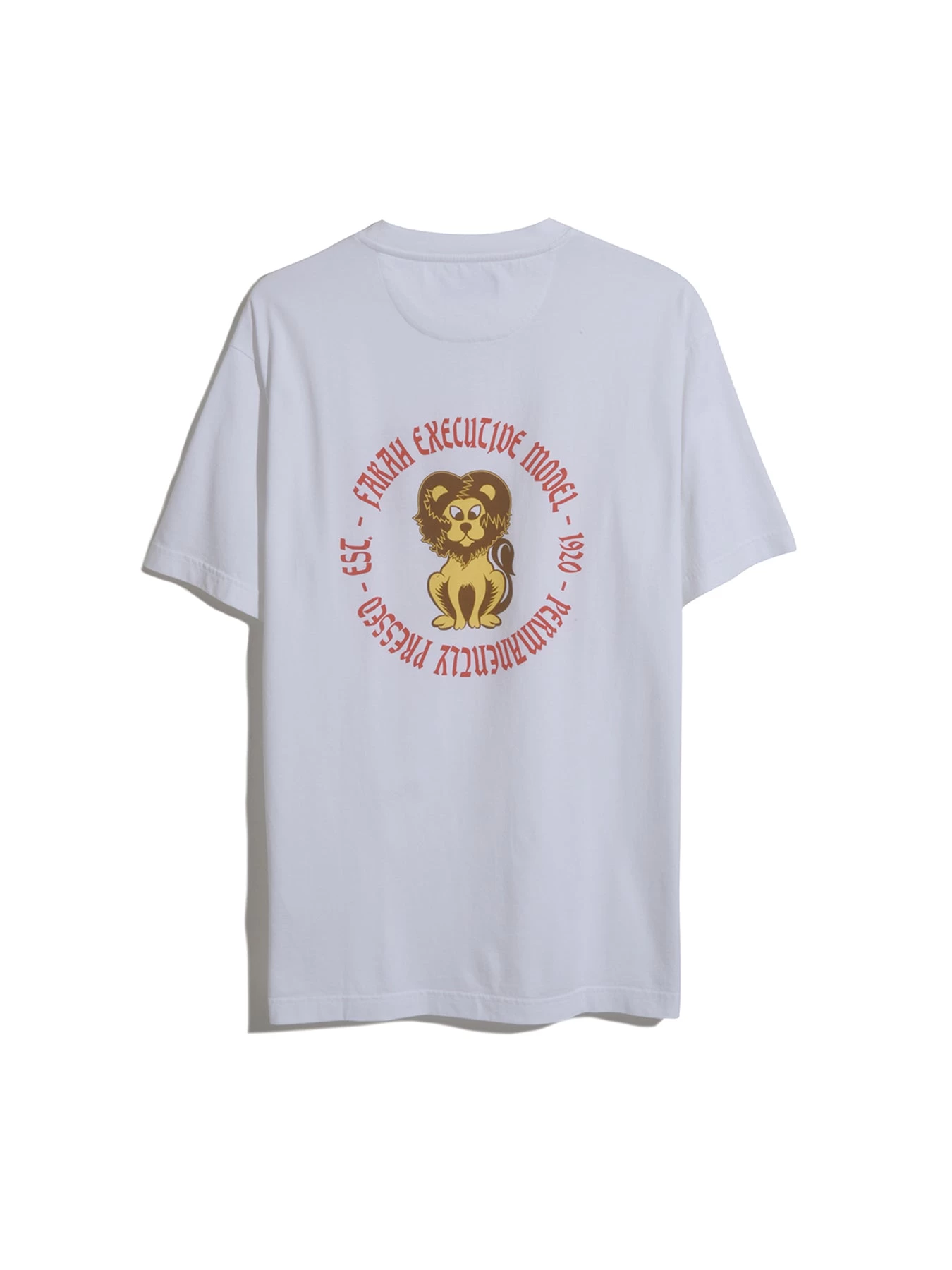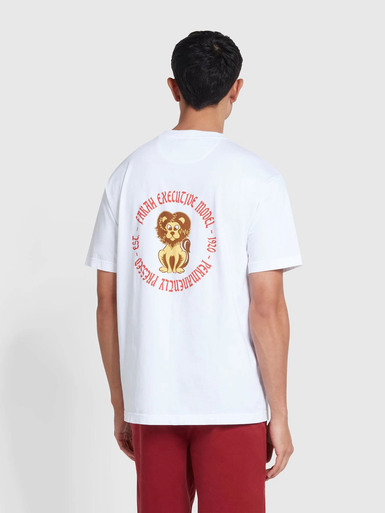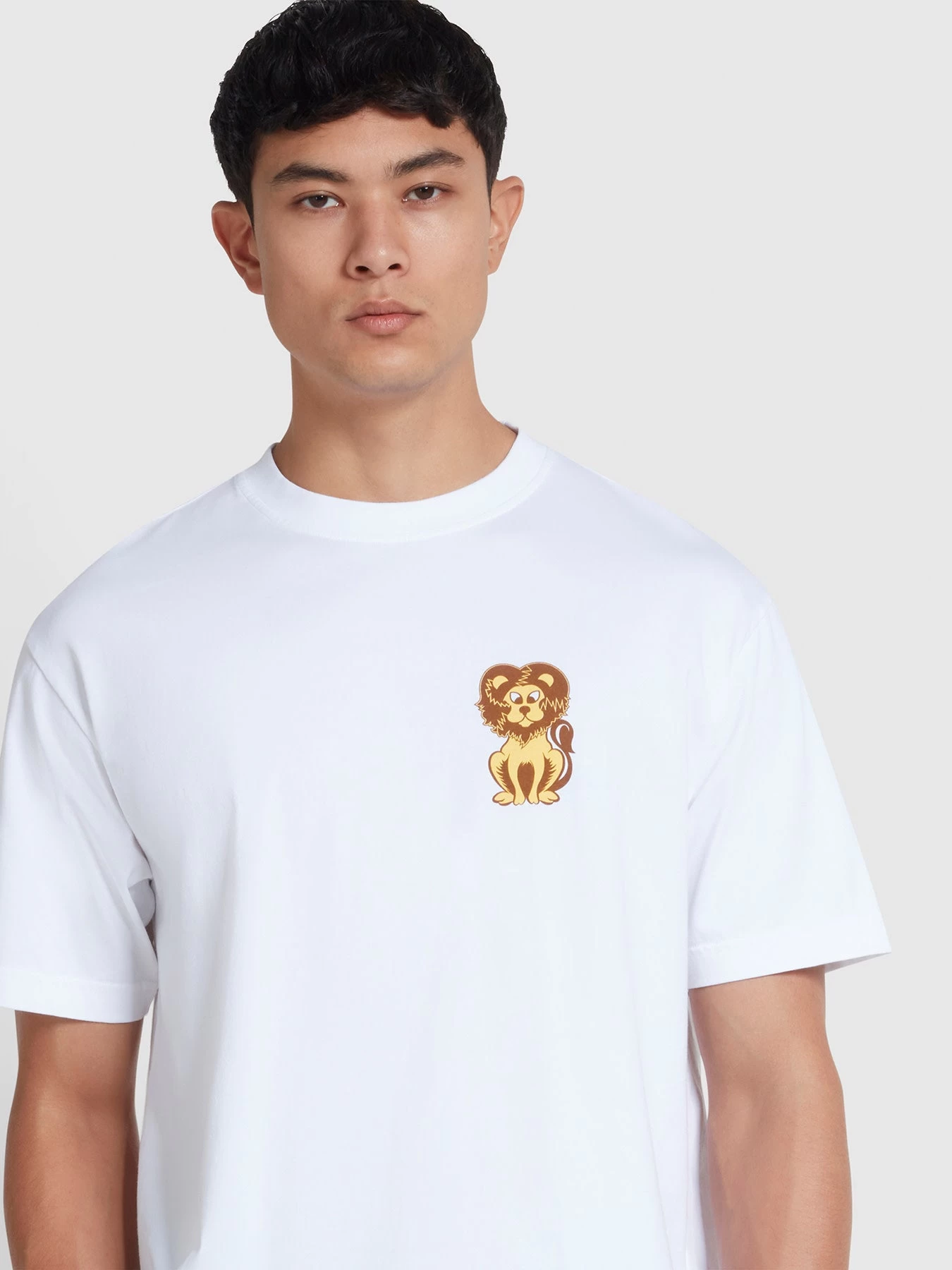 Made from 100% organic cotton, the Xavier Lion Graphic Print T-Shirt In White combines comfort and style. With a relaxed fit and short sleeves, it features a retro lion graphic on the chest and a coordinating printed lion graphic and ‘FARAH EXECUTIVE MODEL’ text on the back.