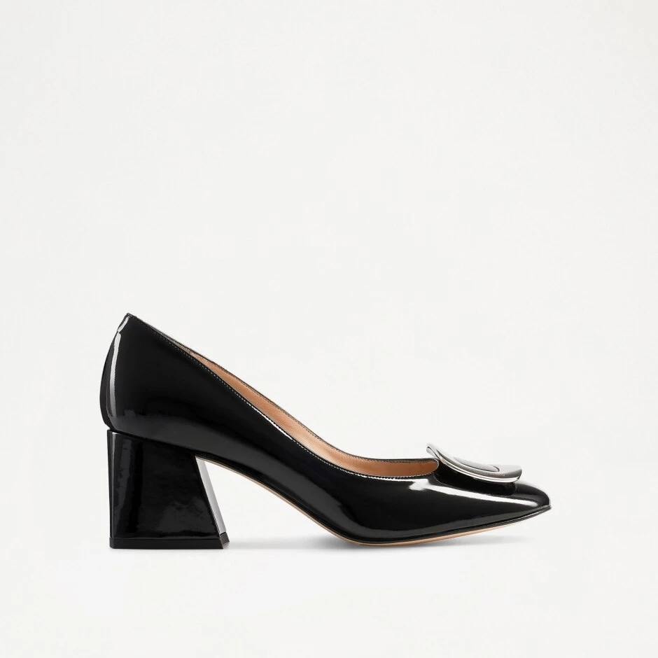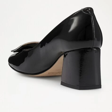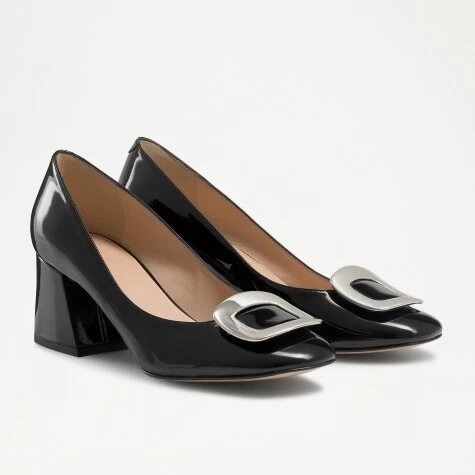 An elegant, event-ready high heel, Statement is our embellished block heel court shoe made from glossy materials. Crafted in Spain from black patent leather, this glamorous design is typified by its striking silver charm embellishments at the front of each shoe. Its polished patent finish adds to the visual decadence, while the slightly flared block heel gives a striking twist to this otherwise timeless piece.