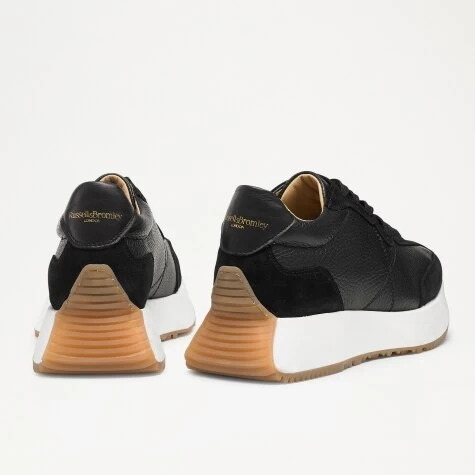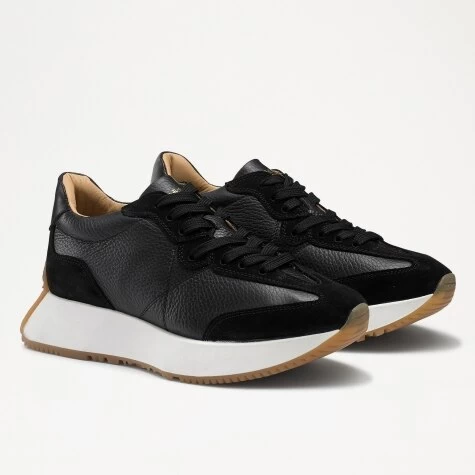 Race into the new season with our chic new iteration of the classic sneaker. Crafted in Italy from soft black grained leather, this modern style boasts the laid-back look of a sneaker upper, upgraded by a contrast sneaker sole with a distinctive hourglass cut. This sporty style perfectly treads the line between casual and formal, making it an ideal addition to your everyday wardrobe.