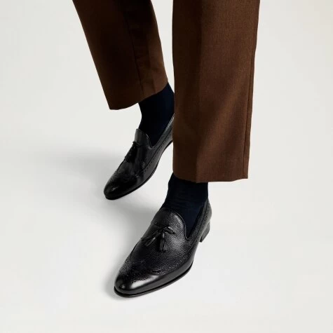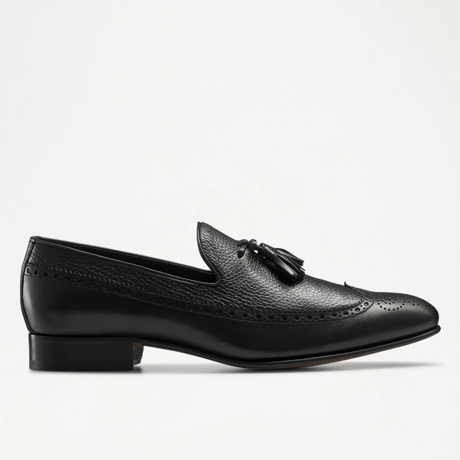 Campus, our deer-skin slip-on shoe, is a smart brogue loafer hybrid. Made from soft black deer-skin leather, this slender design has been expertly crafted in Italy. It features decorative brogue perforations across the upper along with a tassel trim feature across the vamp. It also includes grained leather and smooth leather sections for added visual impact.