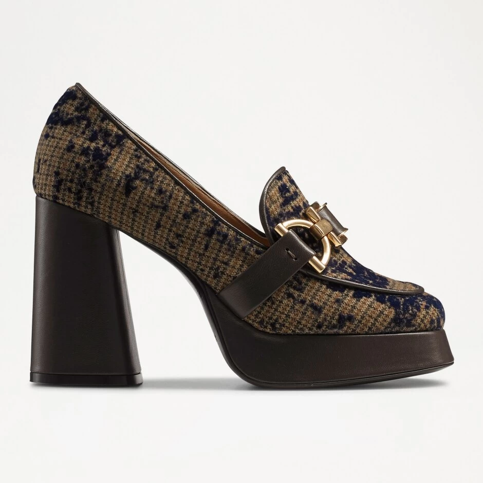 Inspired by Runtheworld, our 70s-inspired platform, Powerful delivers a nostalgic feel fused with heritage details. Constructed in Italy from check-patterned textiles, this statement design features a cylinder block heel and authentic buckle trim. Its square toe evokes a retro aesthetic while the patterned upper adds plenty of visual interest. Featuring a natural leather insole lining, and bold burnished leather platform heel, the style is a perfect fusion of comfort, style and practicality.