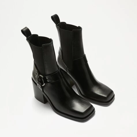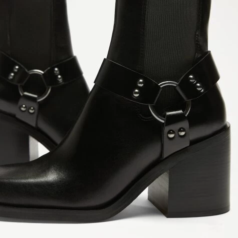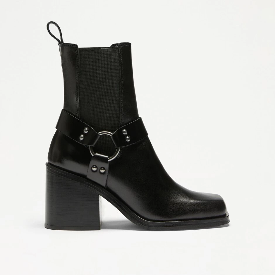 Influenced by this season’s western aesthetic, Jolene is a soft square toe ankle boot. Crafted from soft black calf leather in Spain, this exciting design fuses the silhouette of a classic ankle boot with cowboy boot features. The stud and ring harness straps across the upper give a nod to grunge-girl styling and the cowgirl spirit, while the slim platform with tonal stack heel serves up sophistication in equal measure. Pull-on loops, leather linings and elasticated gussets guarantee a seamless fit.