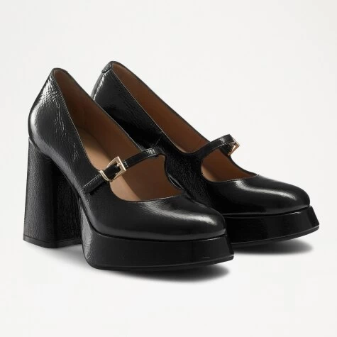 Blending nostalgia with luxurious details, Mary is our iconic high platform mary jane shoe. Produced in Italy from the finest naplack leather, an ultra-soft material, this black design provides elevation with a strikingly polished finish. Inspired by the classic silhouette of mary jane court shoes, this platform style is lifted up to new style levels thanks to its lofty block heel and platform sole. The design comes leather lined and complete with an adjustable foot strap featuring a retro gold buckle.