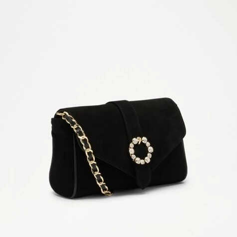 A luxurious take on the classic shoulder bag, Strictly fuses standout details with a staple silhouette. Crafted from the smoothest black suede, the diagonal cut of the foldover flap has been enhanced by a statement gem embellished buckle and jewellery-inspired chain strap that can also be worn crossbody. Finished with an internal zip pocket to keep your necessities safe, this lavish style will add a touch of decadence to your everyday.