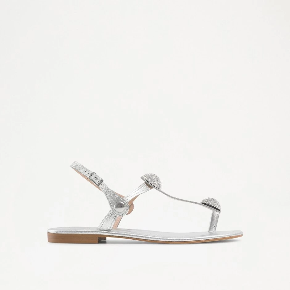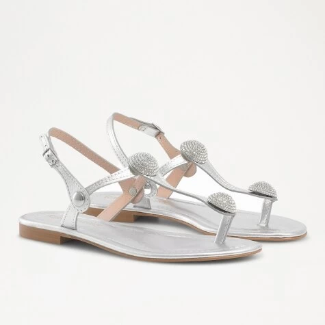 The classic flat sandal has had an upgrade with Asteroids thanks to dramatic diamante embellishments and metallic hardware. Crafted in Italy from supple silver calf leather, this intricate piece takes easy summer dressing to a new level of luxe. The silver-toned leather provides added sparkle while the crystal stud charms on the toe thongs ramp up the glam factor. It’s a versatile flat that definitely packs a style punch.
