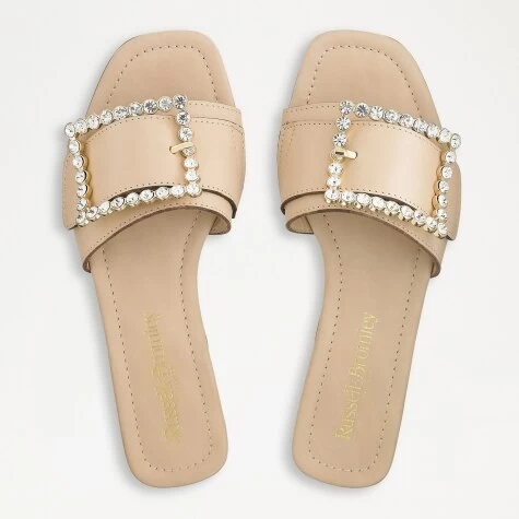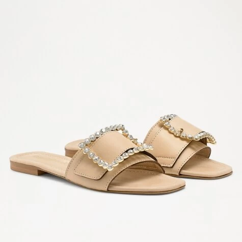 New style Cindy is a glamorous take on a classic slip-on mule. This chic flat sandal is crafted in Italy from soft blush calf leather and set on a durable man made sole. Finished with a dazzling golden crystal embellished buckle, this style is certain to make a statement wherever it is worn. An easy and elegant styling choice as warmer days approach, we love this design paired with a summer dress and woven bag for picnic perfect style.