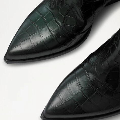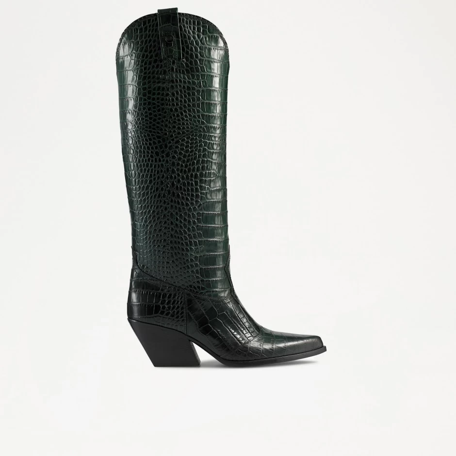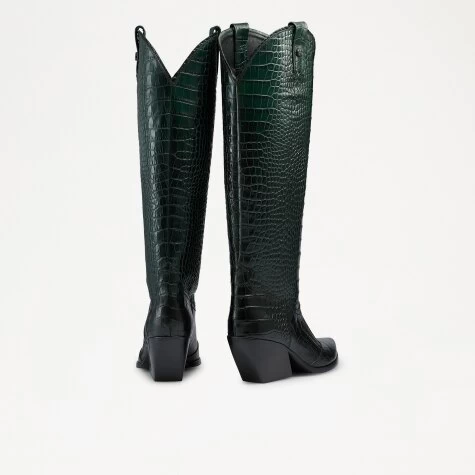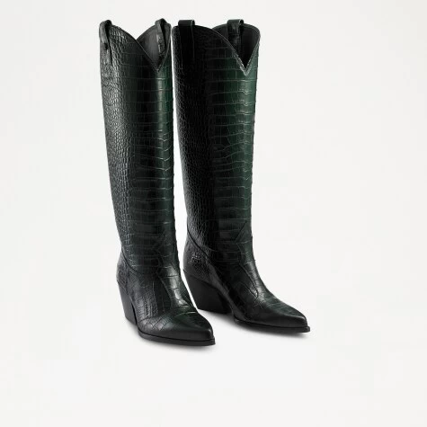 Ride the cowboy boot trend this season with our chic iteration on the western classic. Crafted from forest green croc-print leather this long silhouette rises just below the knee offering extended style. From the kickback heel to the pointed toe, Saloon boasts all the traditional details of the well-known design as well as functional pull tabs that allow you to pull on and off with ease.