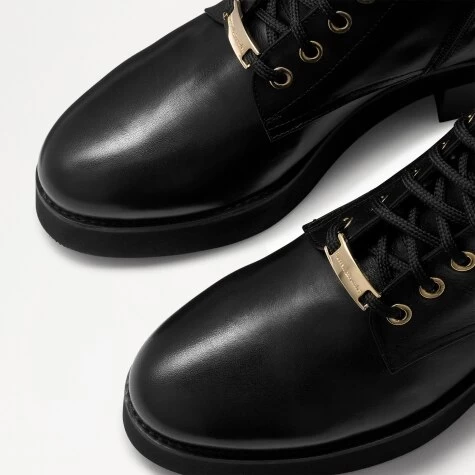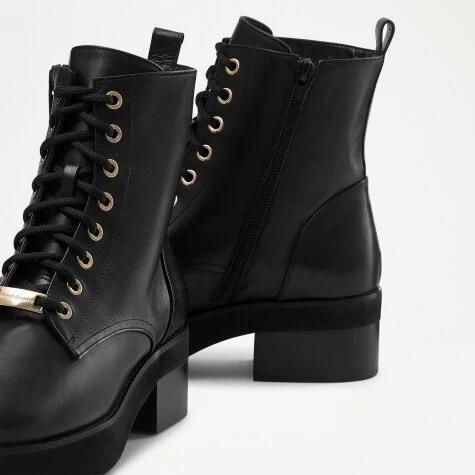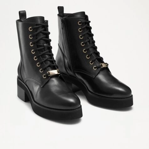 An elegant take on the practical military boot silhouette, Atom will quickly become your new wardrobe staple. Crafted from smooth black calf leather, Atom has been detailed with a soft rounded toe, flattering block heel and golden hardware, adding an air of sophistication to its rugged counterpart. Finished with breathable leather lining and both lace-up and zip fastenings, this versatile boot will walk you through any occasion in both comfort and style.
