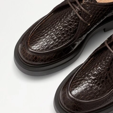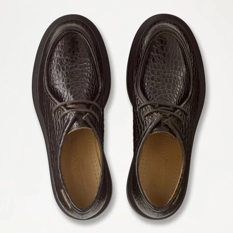 Farringdon is a lace-up slip-on moccassin shoe set on a thick sole. Made in Italy from dark brown crocodile-effect leather, it catches the eye thanks to its textural finish and the trend-led shape of its oversized cloud sole. The design is rounded off with thick tonal laces and comes with branded fabric labels on each shoe.