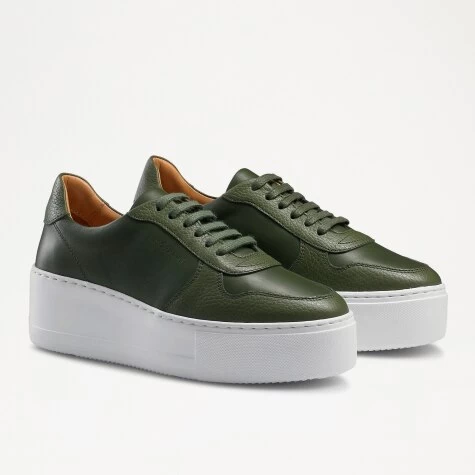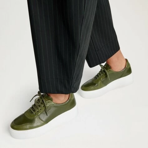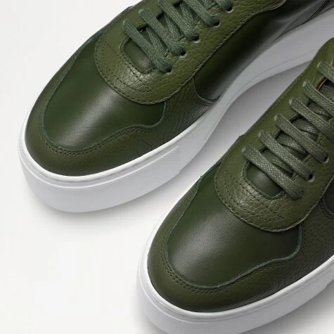 Fusing the accents of a sporty silhouette with a lightweight flatform sole, Park Lace bridges the gap between formal and casual. Updated in the colour of this season, khaki green, this bestselling style has been crafted from the softest grained calf leather. The design started life in a sustainably conscious solar panelled factory and detailed with a padded ankle cuff for ultimate comfort. Finished with a breathable biscuit leather lining, this luxury low top will walk you through your day to day in style.