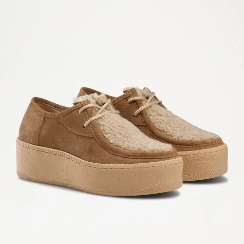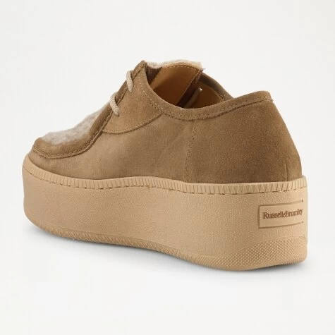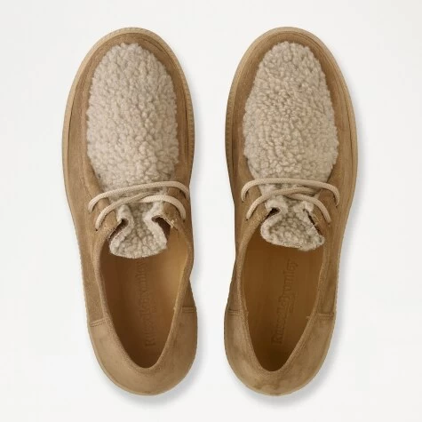 The everyday lace-up takes a softer new direction this season with Cactus+, our shearling moccasin sneaker. Made in Italy from sumptuous tan suede, this inviting style is soft to the touch and even softer to wear thanks to its cosy shearling panels and leather-lined insoles. Set on a chunky flatform sole, the design is ideal for laidback looks or free-spirited days out thanks to its boho-influenced moccassin silhouette. The crepe sole is durable and finished off with a pyramid pattern across the welt.