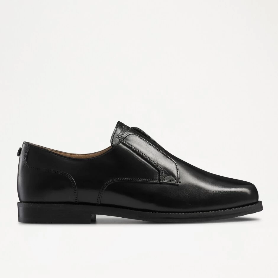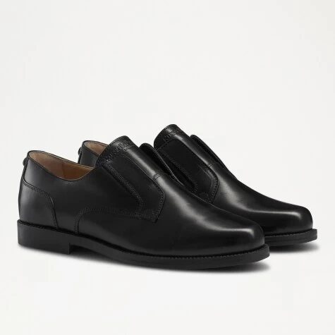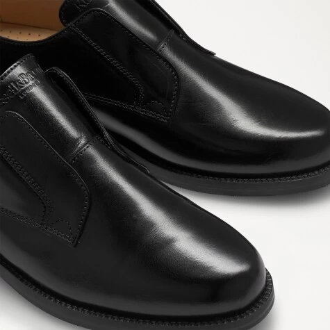 A new addition to our iconic smart shoes range, Monument is a laceless slip-on style. Made in Italy from polished black calf leather, the design is sleek and soft to the touch. Constructed using a streamlined silhouette, the upper is divided into panelled sections with stitch detailing to create a captivating look. Debossed logo branding decorates the tongue, while a branded logo stud finishes off the heel counter. It comes complete on a lightweight leather sole with small stack heel and durable rubberised finish.