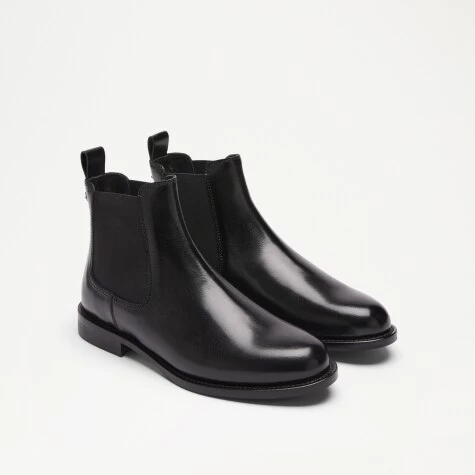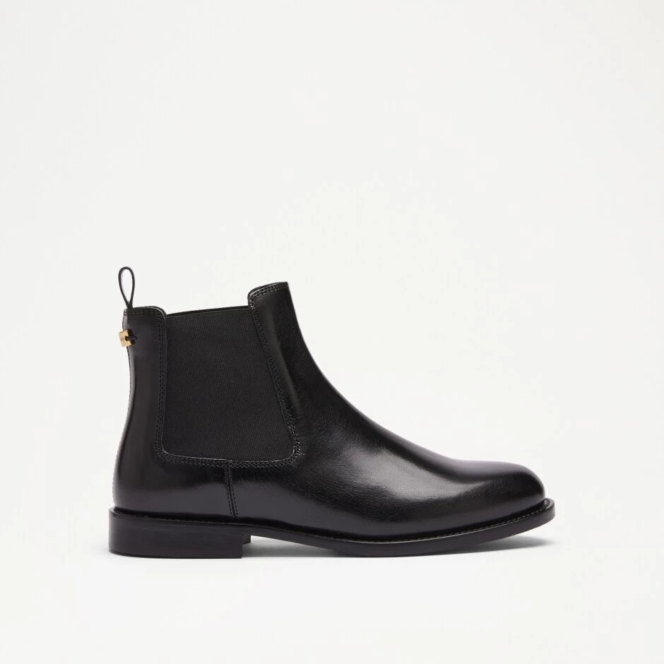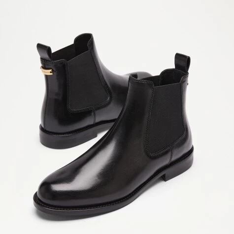 A reimagination of our bestselling Chelsea boot, Bond will be your new go-to shoe for effortless everyday dressing. Crafted in Italy from polished black calf leather, this practical design features a flat heel and sits comfortably just below the ankle. Featuring elastic side inserts and pull-on heel tab for a seamless and easy fit, its rounded off with gold plate detailing on the heel for added glamour.