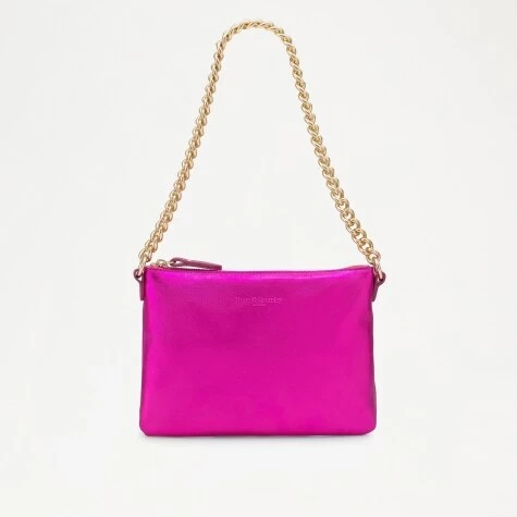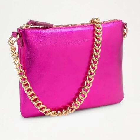 Dress to dazzle with On Point, our mini metallic shoulder bag. Exquisitely crafted from nappa leather in Italy, this super handy design is the grab of the moment thanks to its minuscule shape and high-gloss fuchsia pink sheen. This small but perfectly formed shoulder bag comes with a bold gold chain strap, and is embossed with chic logo detailing. It’s perfect for carrying your everyday essentials around in style.