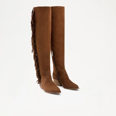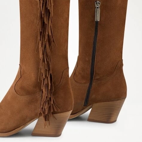 Embodying this season’s trends from top to toe, Swish showcases a luxurious fusion of the boho and cowboy boot revival. Crafted from smooth tan suede, this over the knee silhouette has been detailed with a long tassel trim down the side of the silhouette culminating in a western-inspired kickback heel. Finished with an inside zip fastening that upholds the structure of the silhouette, this style promises to effortlessly raise your styling this season.