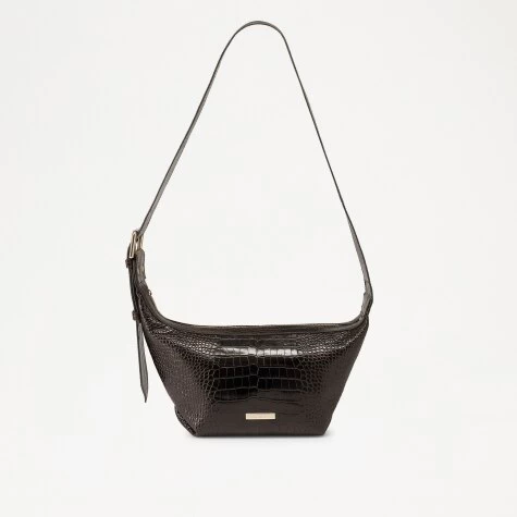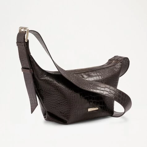 Eclipse is this season’s trend-led overbody bag inspired by nostalgia with a cutting-edge finish. Made in Spain from chocolate-brown leather, this supple and striking design is constructed from wild crocodile-effect embossed leather. Shaped like a trapezium, it celebrates this season’s preference for retro-influenced geometric shapes. This casual shoulder bag is perfect for everyday adventures, or dressed up looks thanks to its glossy design and practicality. Featuring a chunky adjustable crossbody strap and easy-open zip-top fastening, it’s rounded off with an inside leather logo patch and pewter-hued hardware.