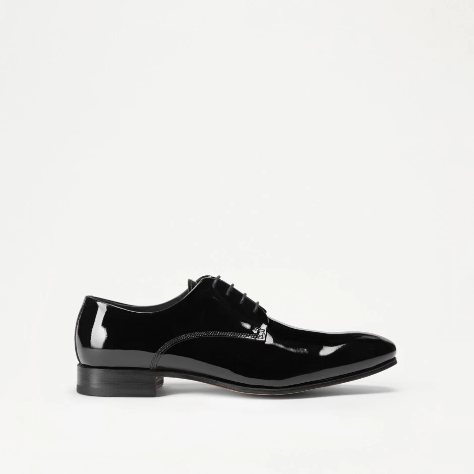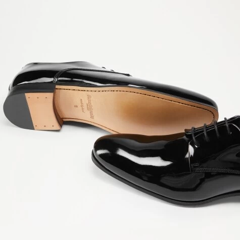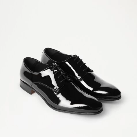 Evoke the Rat Pack, rather than the rat race with the new derby Sinatra. Expertly handcrafted in Portugal from luxuriously glossy patent leather, this four eyelet lace-up is detailed by a channel stitched full leather sole and half rubber top piece. We recommend pairing with white tie and cocktails.