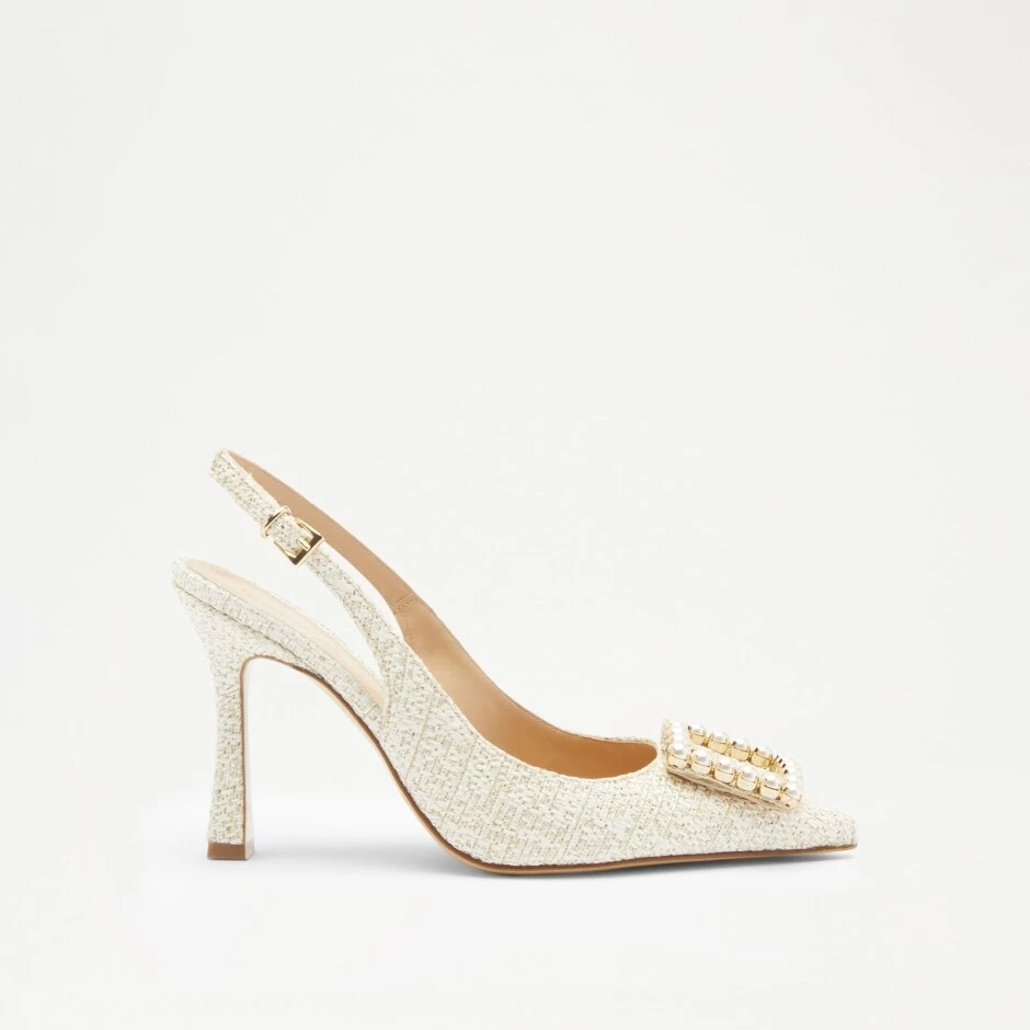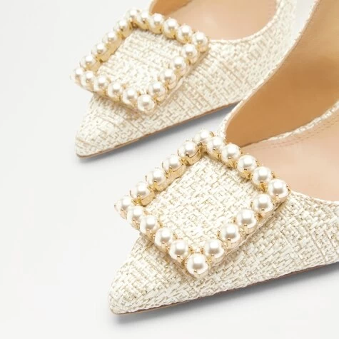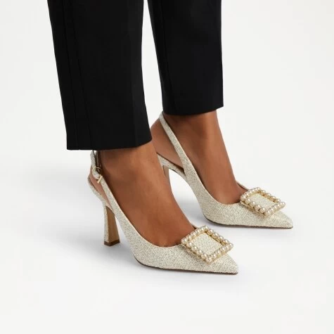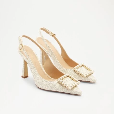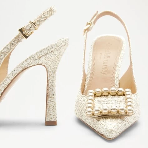 Take a step towards glamour with our statement slingback heel Midnight. Crafted from cream tweed canvas material with a gold thread detailing and a pearl embellished buckle for a chic finish. Drawing inspiration from our bestselling slingback, Fairytale this stlye has been finished with a slightly higher kitten heel whilst uploading the same elasticated sling-back strap, which can be worn around the heel, over the foot or tucked under the bottom of the shoe to give a mule effect. Offering comfort, support and the option to style your own way, with or without the perfectly coordinating bag, Midnight will fast become your go-to style.