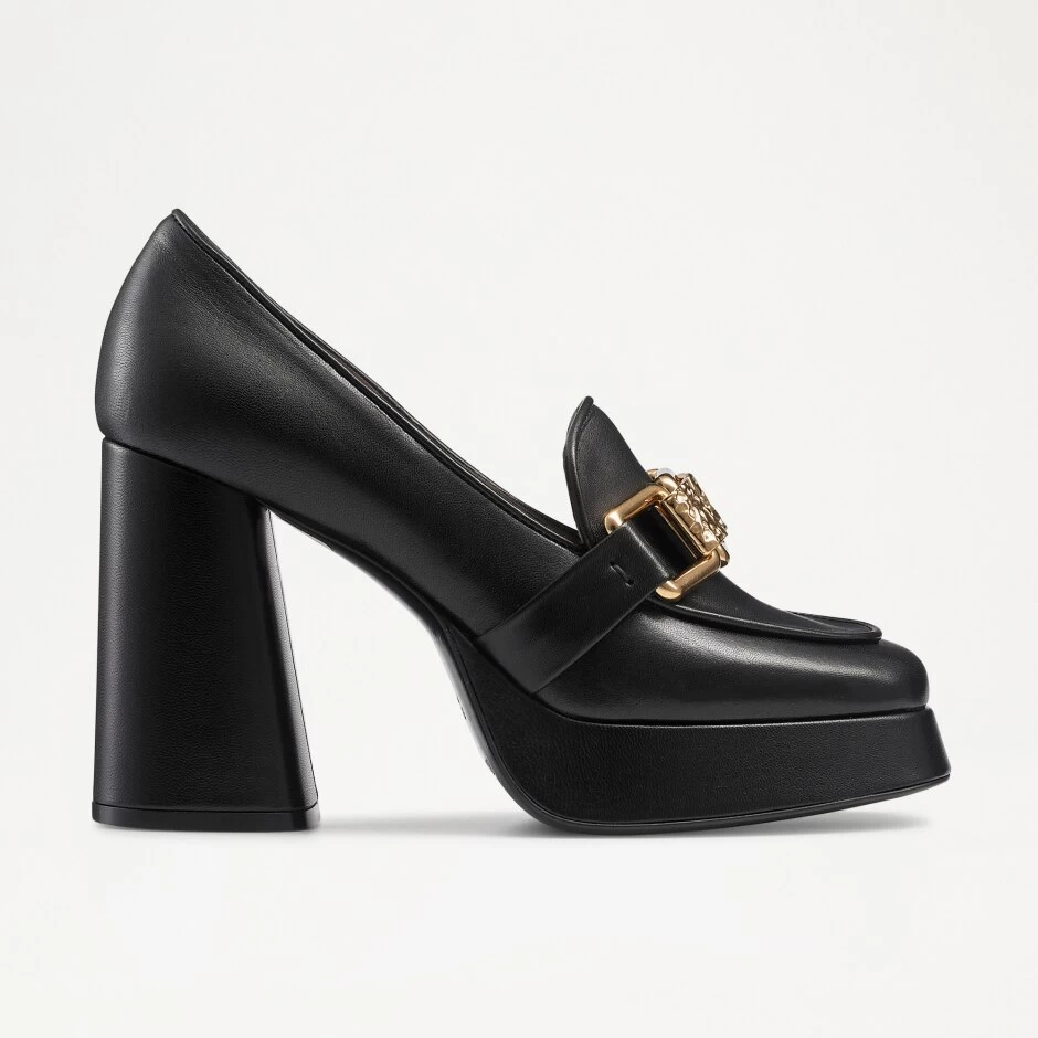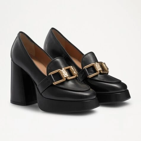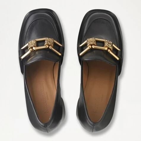 Drawing on this season’s 70s revival, Runtheworld fuses our iconic loafer silhouette with trend-led details. Crafted in Italy from cream nappa leather, the design has been enhanced by rich black piping outlining the shape of the silhouette. Finished by a maximalist gold chain trim and set on a contrasting platform block heel, this elevated loafer will add a chic touch to your everyday styling.