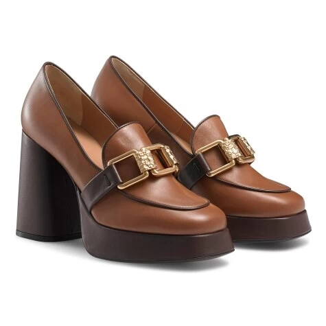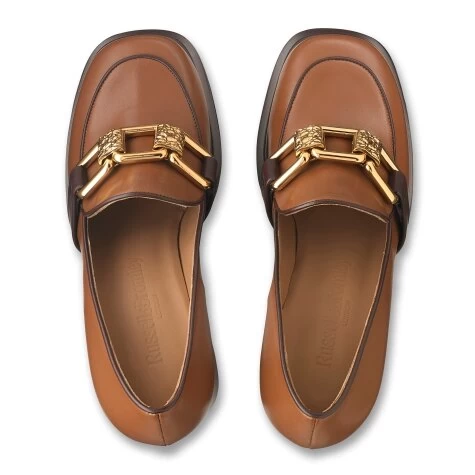 Drawing on this season’s 70s revival, Runtheworld fuses our iconic loafer silhouette with trend-led details. Crafted in Italy from tan nappa leather, the design has been enhanced by dark brown piping outlining the shape of the silhouette. Finished by a maximalist gold chain trim and set on a contrasting platform block heel, this elevated loafer will add a chic touch to your everyday styling.