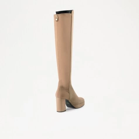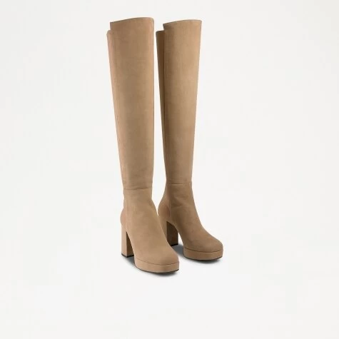 Stepping up the resurgence of the long boot silhouette, say hello to our platform knee-high, HoneyHi. Crafted in Italy from smooth tan suede, this luxurious long boot transcends over the knee with a panel of elasticated stretch suede at the back allowing for ease when pulling on and off. Finished on a tonal suede-wrapped heel and a softly pointed almond toe, allow this sophisticated take on the long silhouette to walk you through a multitude of occasions for seasons to come.