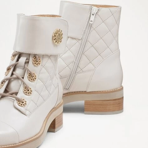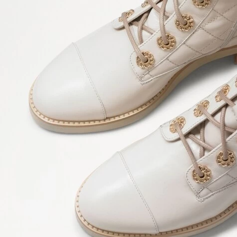 Luxurious craftsmanship meets intricate details in ankle boot Ringaroses. Crafted in Italy from soft quilted white calf leather, this striking silhouette boasts a patent leather toe cap, golden hardware and a sleek ankle cuff, taking the classic lace up and elevating it to the next level. Featuring a hidden inside zip fastening for ease of wear, this staple ankle boot is certain to add a little luxury to every day.
