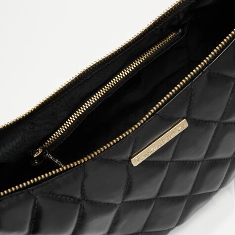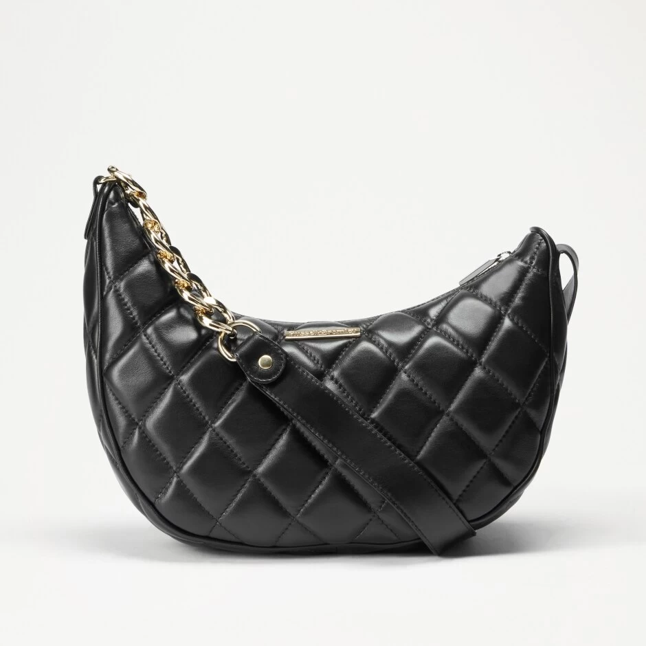Smoothly shaped in soft-touch leather, Solar is our quilted crossbody bag with glistening adornments. Constructed in Italy from black nappa leather, this versatile design will instantly update your everyday looks and going-out ensembles. Practical yet chic, it features a curvy shape, while padded quilting gives it a textural finish. It comes with an adjustable leather strap adorned with pale gold buckles and a chunky-finish chain. Black textile lining and a zip fastening with logo details complete the look.